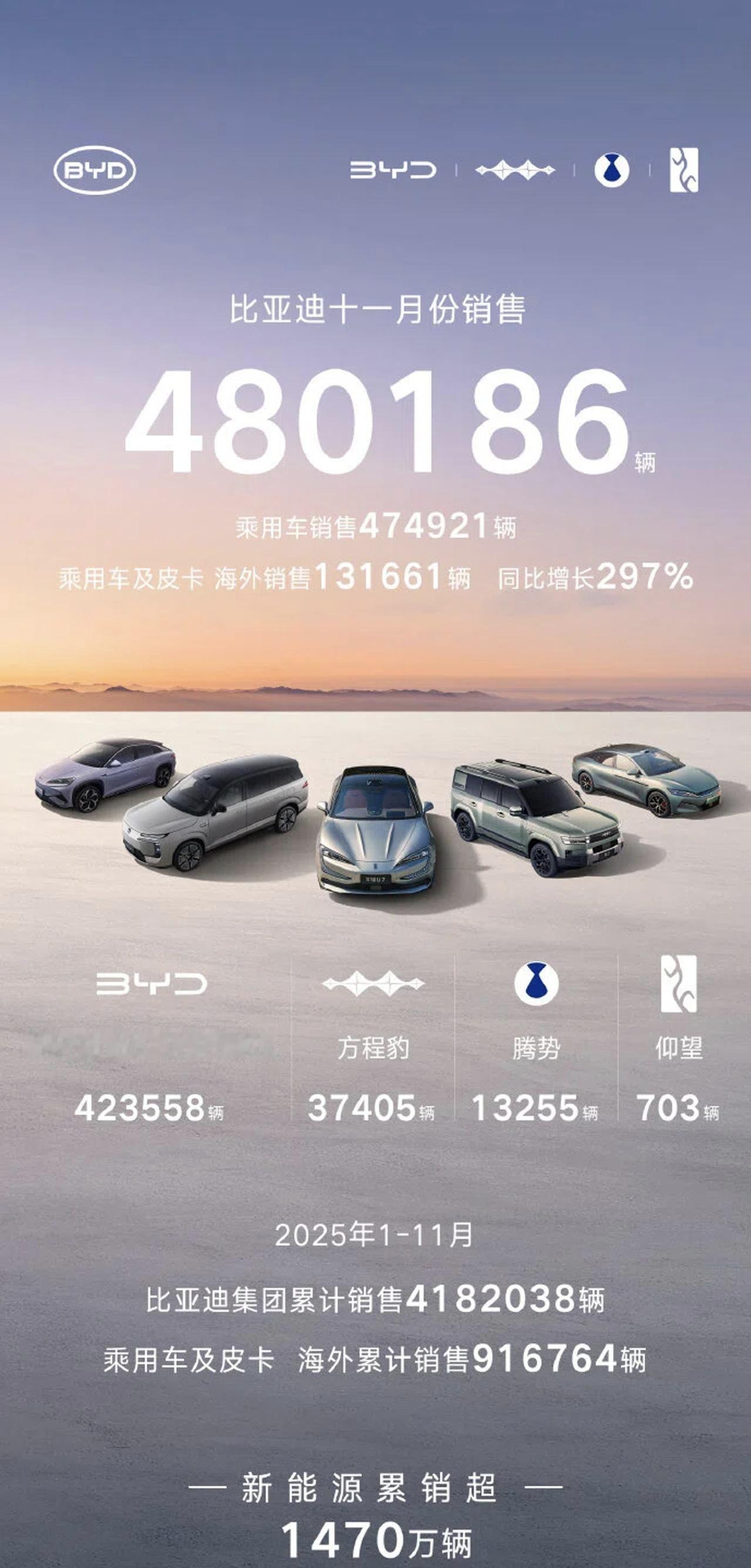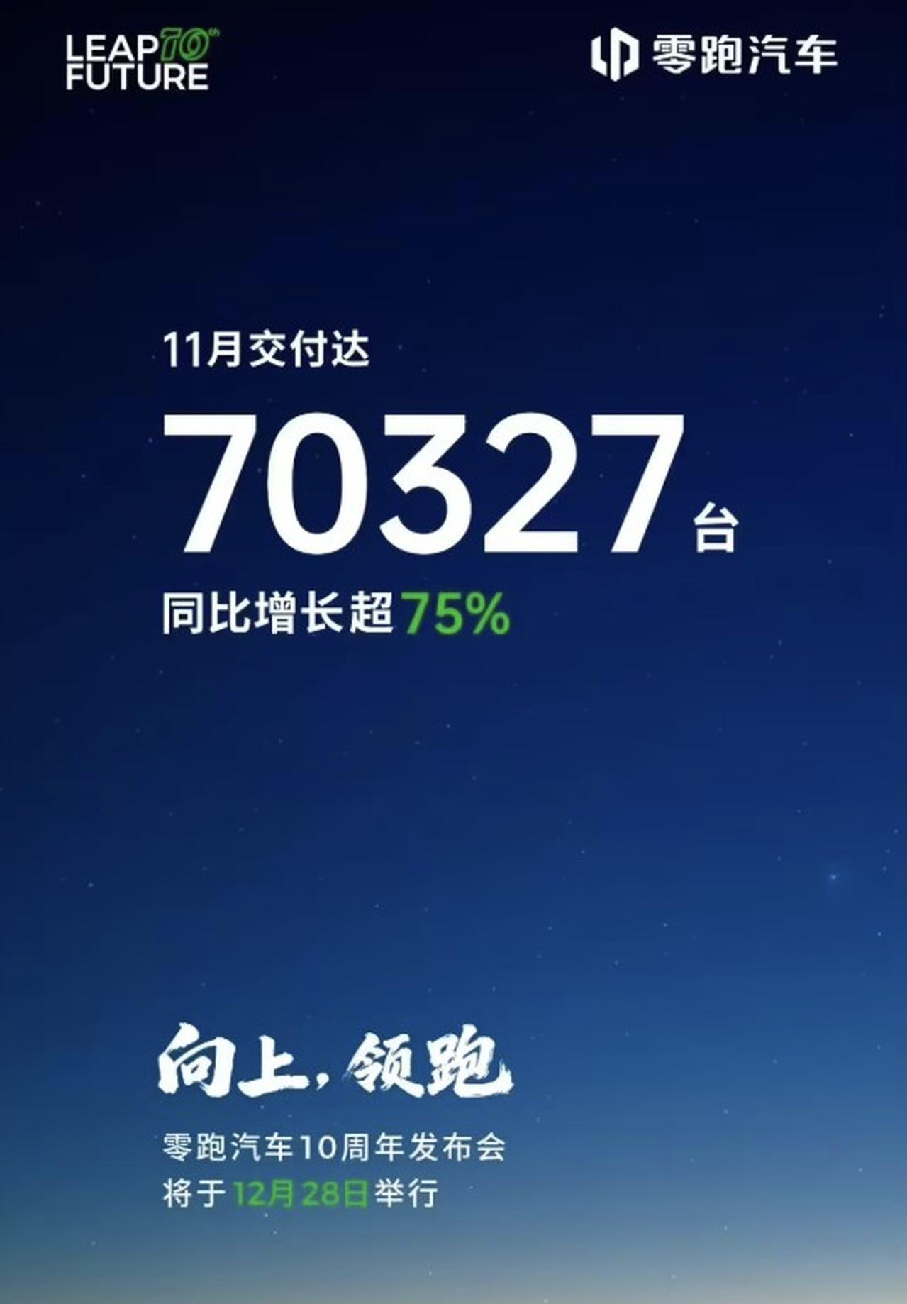 不少车企公布11月销量了,两大看点! 一是造车新势力销量排名发生巨大变化,前几个月零跑汽车一直领先排名,鸿蒙智行紧随其后,零跑11月销量虽然超过7万辆,同比销量大增,但还是没有保住第一的排名,鸿蒙智行11月销量一举超过8万,拿下第一,这个新势力销量首次破8万辆,12月月份极有可能达到10万辆,一方面是品牌方极有可能会加速去实现这一目标,另一方面是,明年新能源车开始征收购置税,消费者的购买情绪会更浓厚,况且12月也是购车的时候高峰期,等待月末验证! 二是比亚迪11月卖出了48万多辆,1-11月累计卖出418万辆,海外卖出超96万辆。势头很猛,按照这个趋势今年海外破百万辆板上钉钉了,总销量大概率会在470万辆左右! 年终销量大战如火如荼,谁会最终夺冠? 零跑销量战报 比亚迪的新能源汽车销量表现如何