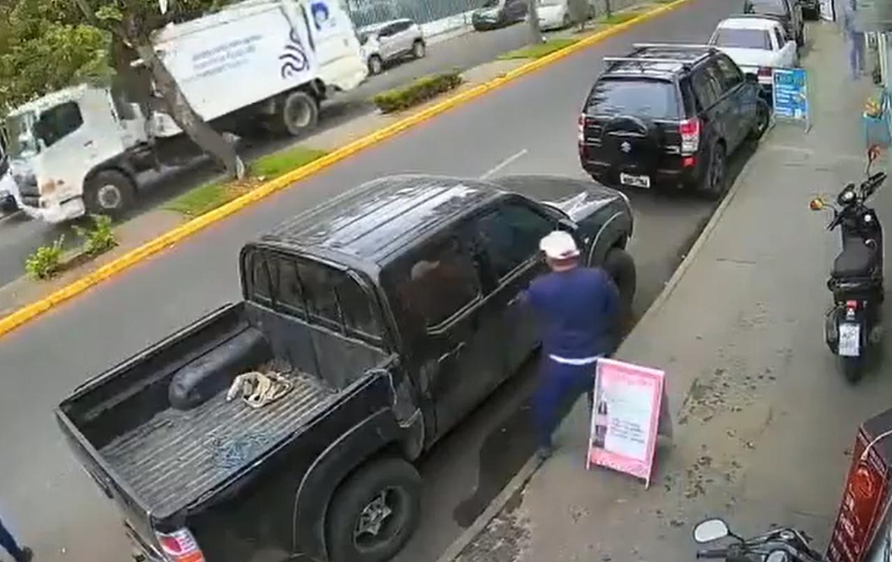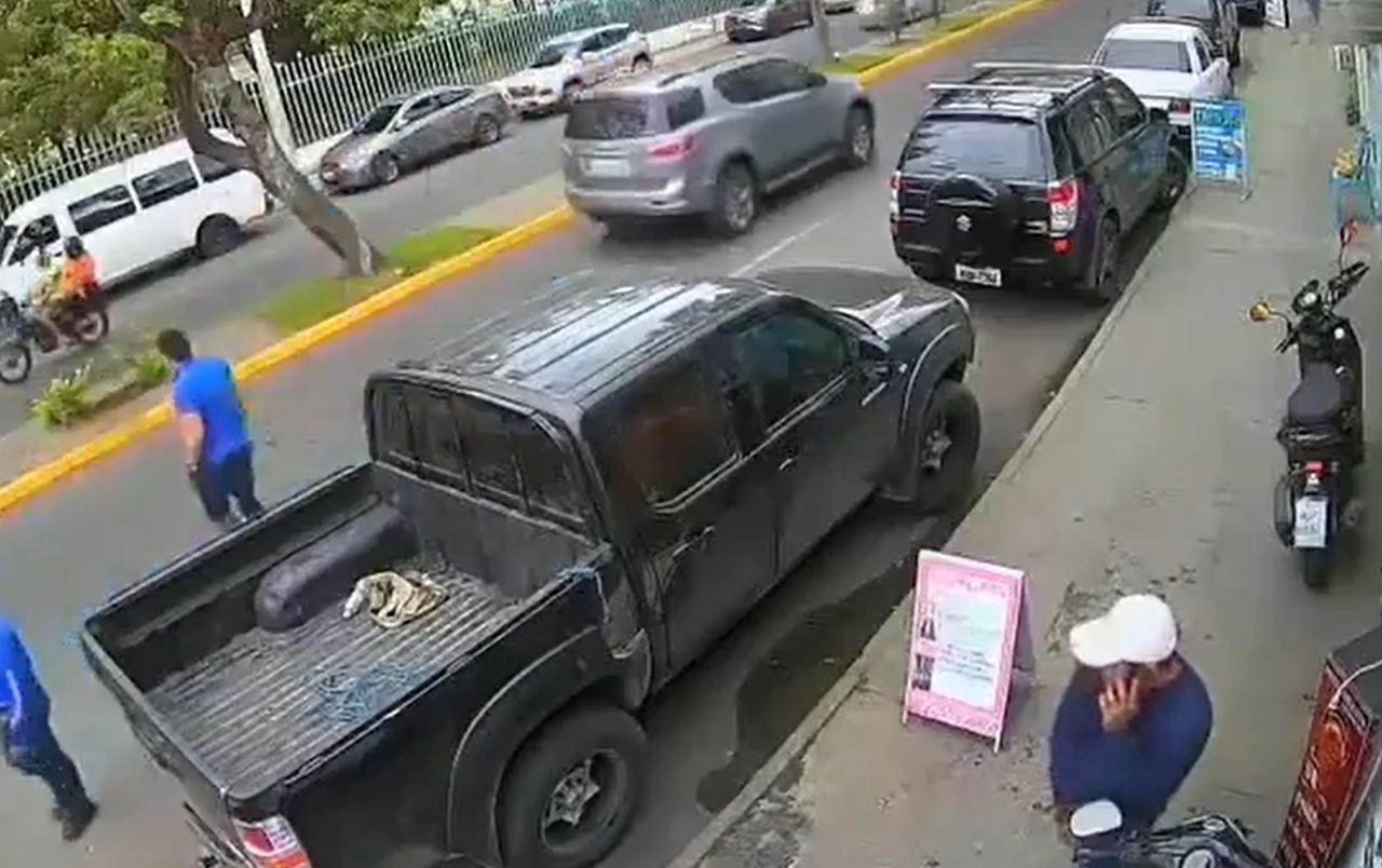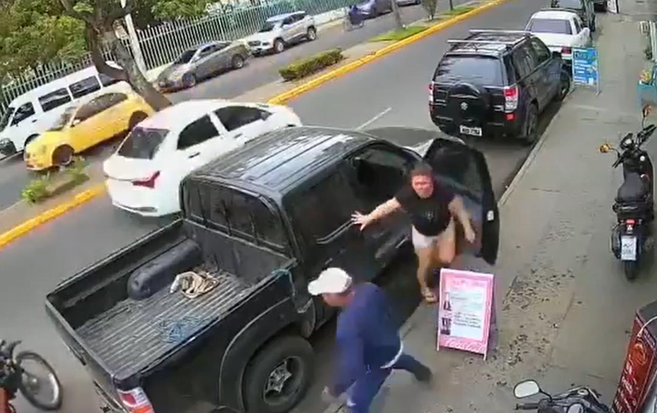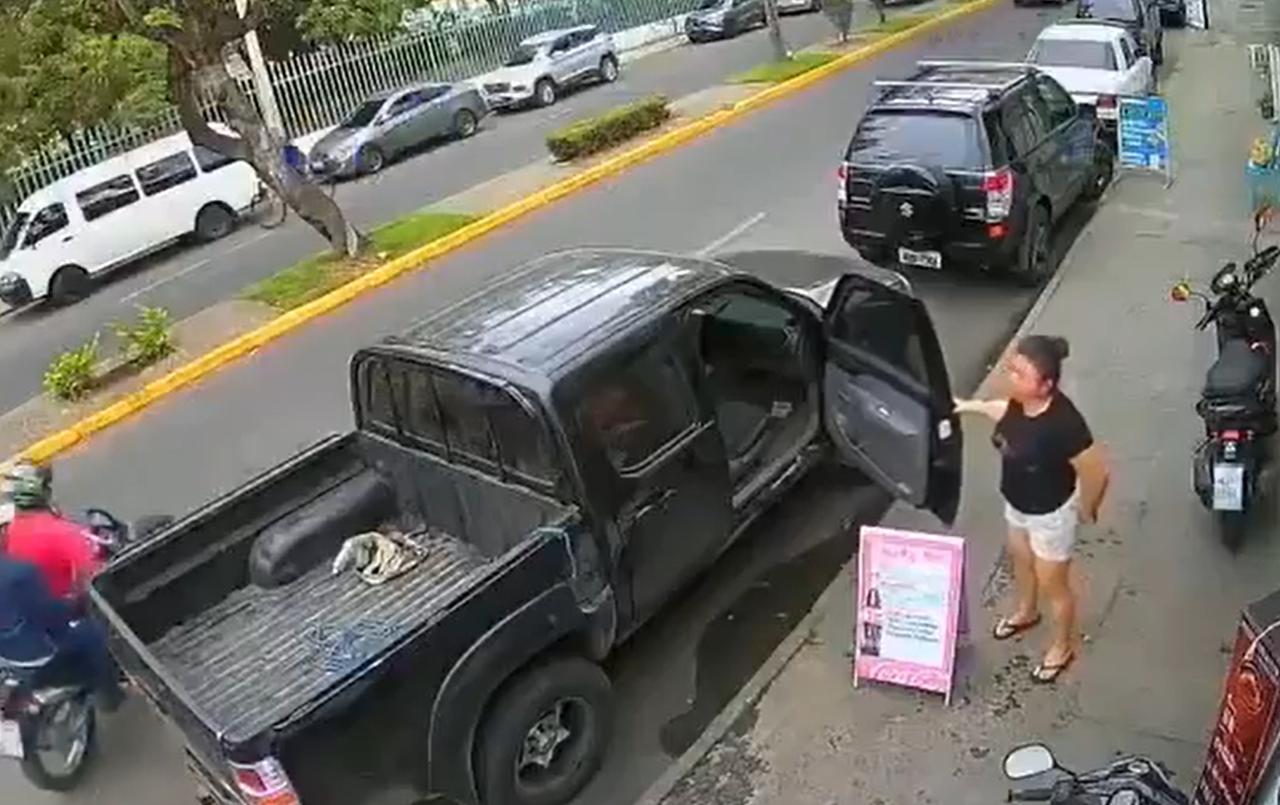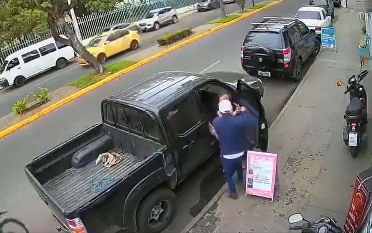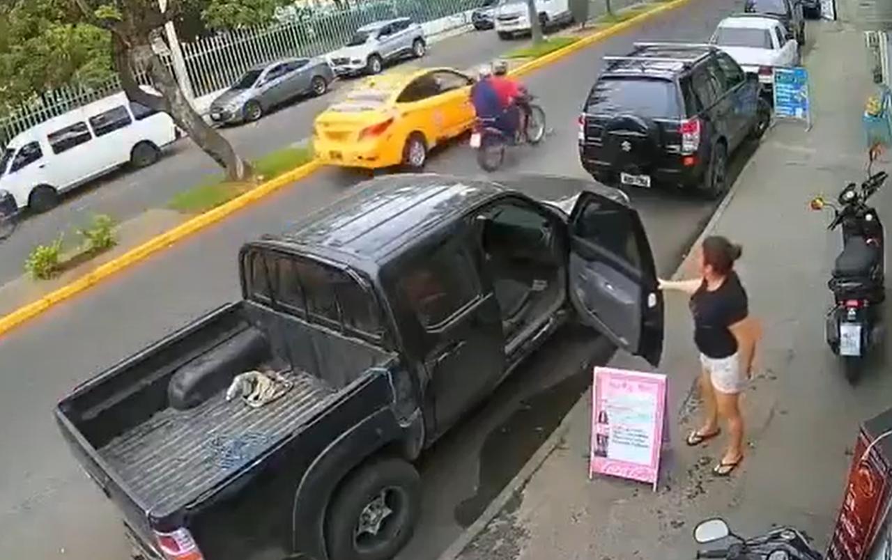厄瓜多尔的波托維耶霍市 一名男子假装打电话,趁机抢劫了一名坐在卡车里的女子。 这起事件被监控摄像头拍了下来。 在视频左下角的一辆摩托车已经准备好逃跑。