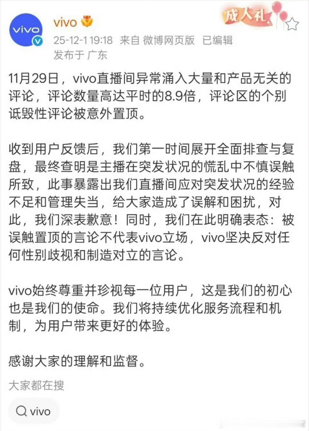 vivo回应直播间风波vivo官方回应直播间事件,由于主播在突发情况下不小心误触置顶不适言论。这件事就这么告一段落了,这个主播这次倒霉了,给品牌造成这么大的舆论压力,以后还是得慎重。