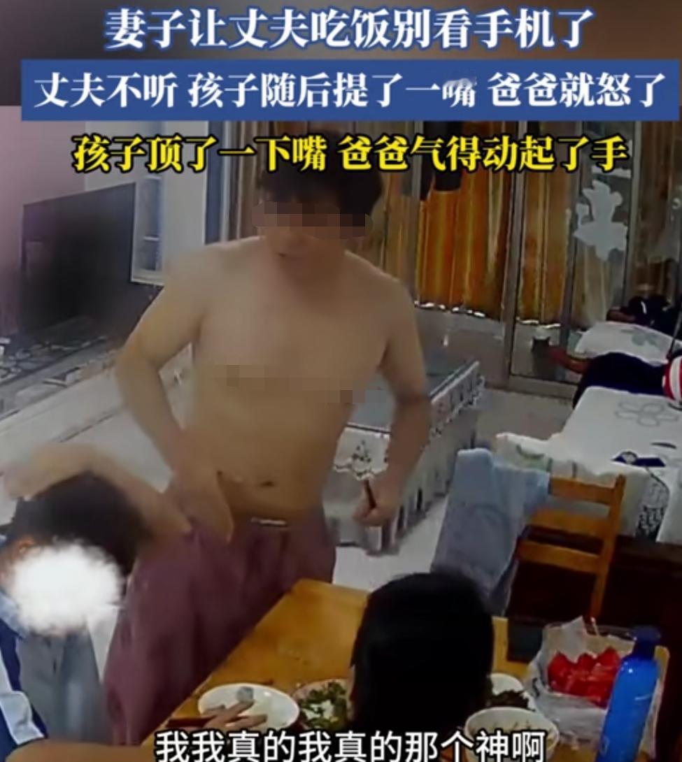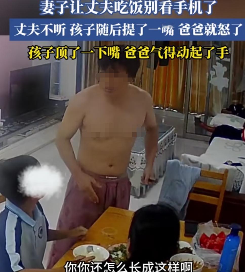 子不教,父之过! 一家三口吃饭,男的不停的刷着手机,妻子让丈夫吃饭别看手机了,丈夫不听,孩子随后也跟劝了一句。 这位爸爸就不高兴了,翻着儿子的旧账,说其120分的试卷仅考了5分,脑瓜子不灵光,还敢说老子的不是。 老子教育儿子,本无可厚非,可儿子却在做怪动作,摇头晃脑做鬼脸,老子说他还顶撞,最终激怒了当爸爸的,直接动手给了个完整的童年。 视频中可见两点细节,一个是男的动手教育儿子,其子不服管依旧顶撞。另一个是,孩子妈妈并未阻拦丈夫的举动。 妻子说没问题,孩子紧跟着再说一句,有一点不妥了,当父亲的可能压抑许久,把自己的失败转嫁给孩子,发泄自己的不甘。 作为家长思维混乱,脾气暴躁,万不可取,吃饭不玩手机,自己要给孩子做个榜样,至于孩子的成绩那是另外一回事,可以吃完饭好好说。 家长自己犯错不提,反过来指责别人的问题,这样也教育不出优秀的孩子,也是很多家庭的孩子不成才的原因。 父亲打孩子虽不对,但是这个年龄如果不打的话,孩子会觉得自己说啥父亲都要听,家长要立好权威。 可以在合适情况下适当动手,切记不要在饭桌上动手。也庆幸自己这么多年养成了这点习惯,吃饭时不刷手机,同时也是这么教育小孩的。 父亲怒扇儿子 父与子的相处
