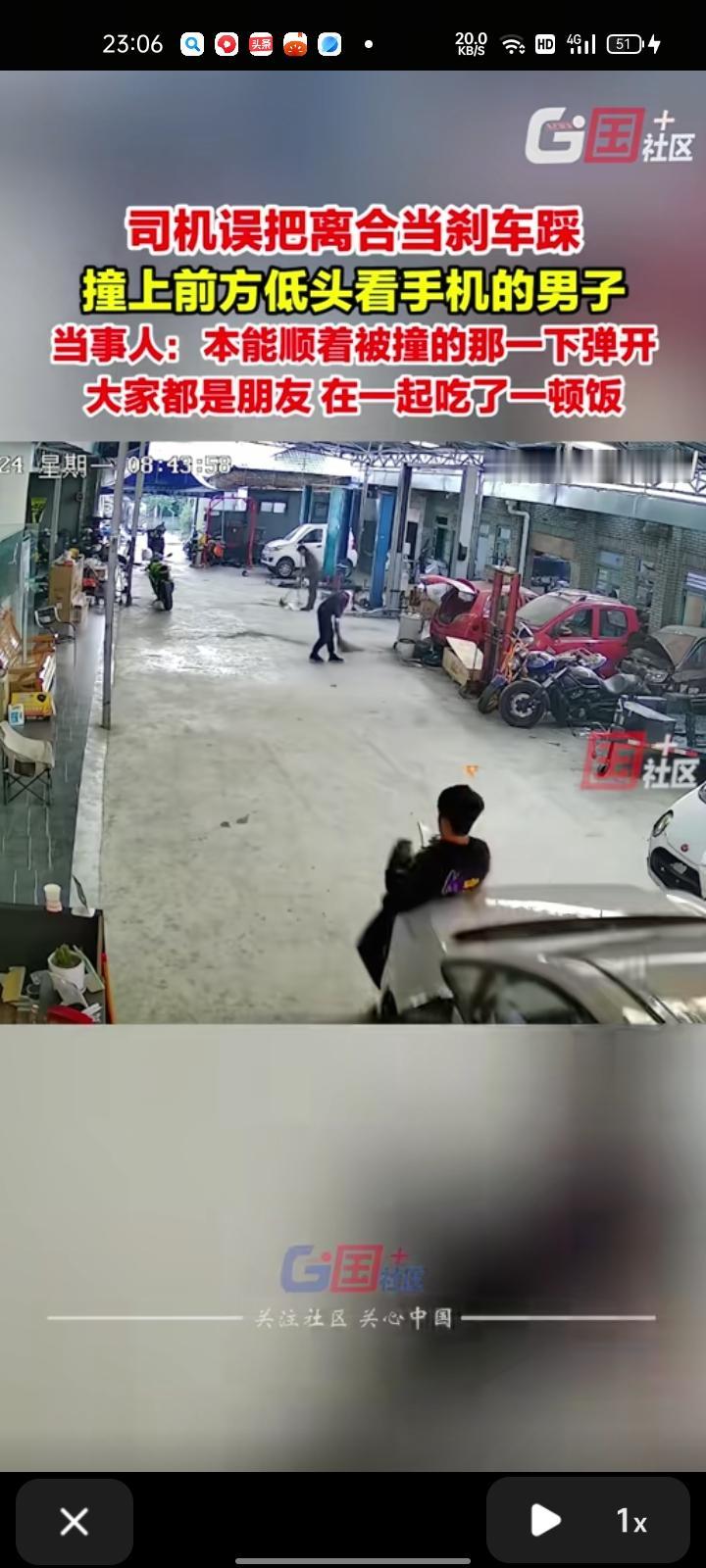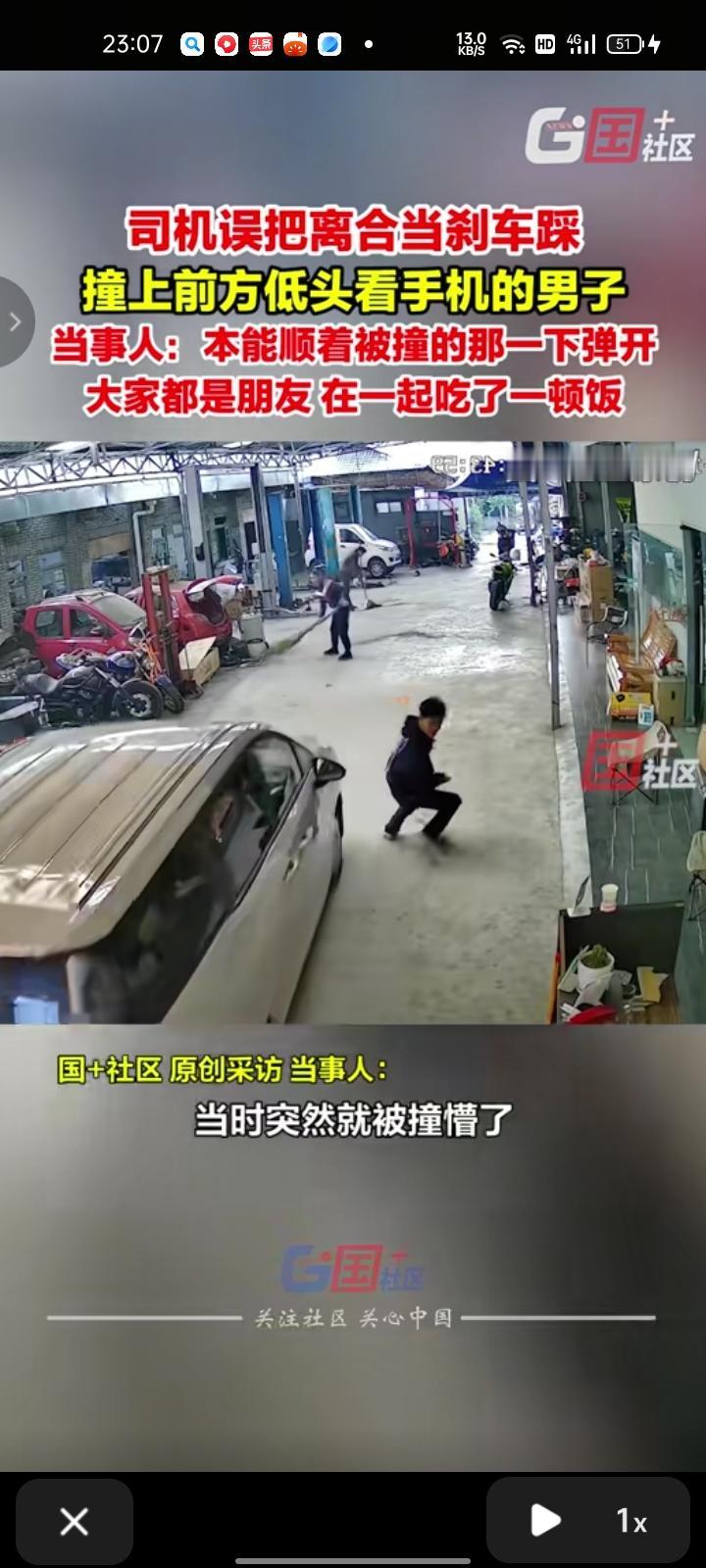 11月24日,四川成都。司机误把离合当刹车踩,撞上前方低头看手机的男子,男子本能顺着被撞的那一下弹开。 当事人称,司机是其认识的朋友,他把离合当刹车踩了、自己只是轻微扭伤,没啥大事大家一起吃个饭,休息几天。希望司机们开车之前一定要检查好车辆情况,行驶时注意路况,行人走路时不要玩手机