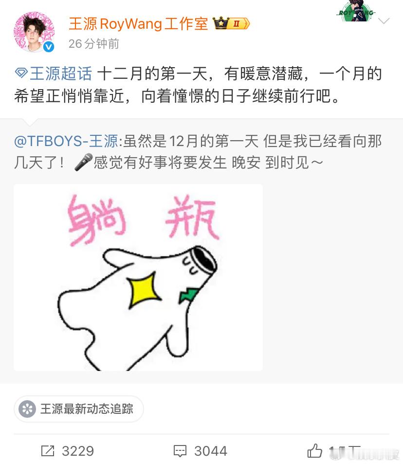 王源感觉有好事将要发生王源12月的第一天发文!所以在年末到来之前,还有更多“好事”是吗 新专辑也要来啦 是吗 嘿嘿 充满期待的十二月开始啦🥰到时见王源客厅狂欢跨年演唱会