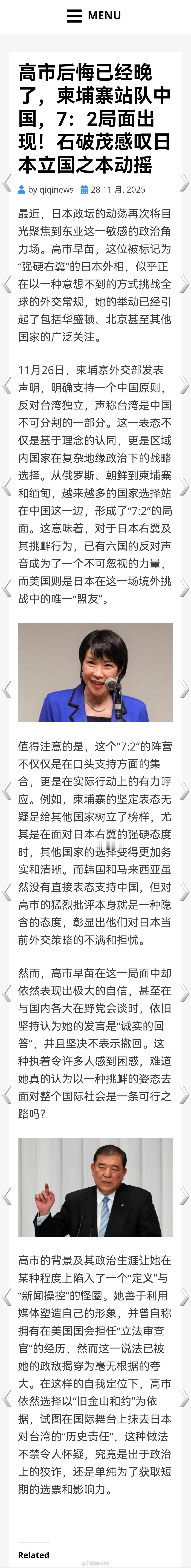 高市后悔已经晚了,柬埔寨站队中国,7:2局面出现!石破茂感叹日本立国之本动摇。日本国宝级歌手喊话高市爽快一点海外新鲜事何天恩