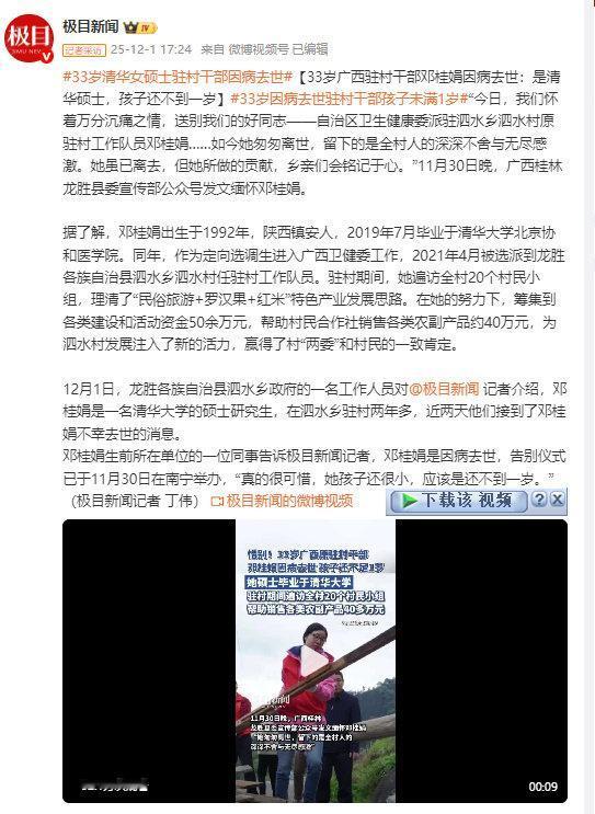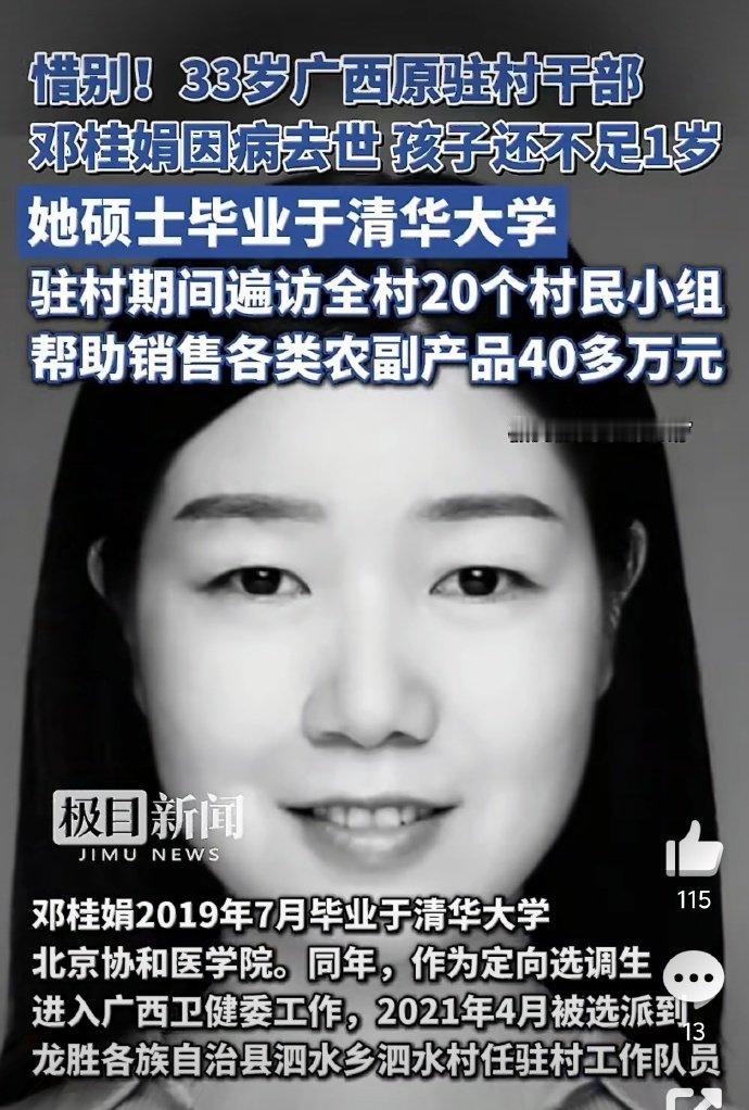 那一刻,脑海里瞬间浮现出黄文秀的身影,她们何其相似!她们都是这个时代最闪亮的“追光者”,却选择做最接地气的“点灯人”。她们的青春,没有在光鲜亮丽的写字楼里旋转跳跃,而是深深扎进了泥土,把脚印和汗水,酿成了脱贫攻坚、乡村振兴的甘泉。 🔥 驻村优势硬核输出:从“清华牌”到“黄文秀精神” 这绝不仅仅是感动,更是值得我们深思的“时代命题”: 他们是政策的“翻译官”:用专业知识和高维视野,把国家的“大蓝图”翻译成老百姓听得懂、能操作的“小秘方”。驻村干部凭借学历、经验的优势,能一针见血地找到乡村发展的“病灶”,把产业扶持、人才引进、环境治理等政策组合成一套“乡村振兴组合拳”。 他们是资源的“联络站”:利用母校、单位、社会各界的资源,把“外面世界的精彩”引进来,把“乡愁里的好物”带出去。他们像一根根血管,打通了城乡之间的“任督二脉”,让数字经济、电商物流、文旅创意这些新鲜血液流淌进古老的乡村肌体。 他们用青春和生命书写的,就是一首“把论文写在大地上”的壮丽史诗!他们不是在作秀,而是在拼命!他们用自己的“舍小家、为大家”的奉献,诠释了新时代青年干部“铁肩担道义”的硬核担当。 🌾 别让鲜花徒留芳华:致敬,更要珍惜! 我们致敬所有扎根基层的青年干部,他们是推动乡村振兴不可替代的“特种兵”!他们的汗水,是灌溉希望的雨露;他们的生命,是照亮前路的火把。 但致敬的同时,我们更要大声呼吁:请给他们减负!请给他们关爱! 乡村振兴是持久战,要的是“细水长流”的韧劲,而不是“透支生命”的悲壮。 愿所有奔跑在振兴路上的青春,都能被温柔以待,都能健康平安地抵达胜利的彼岸! 让我们一起为这些最可爱的“泥土里开出的青春花朵”点赞、加油!