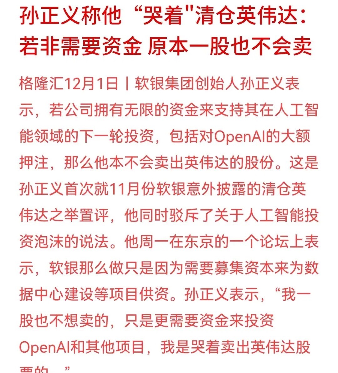 有点忽悠的成分,钱赚到了,还说不应该卖软银创始人表示本来不想卖英伟达的股票,但是由于资金短缺,不得不卖英伟达的股票。但是,从持仓看孙正义2017年买过一次,2019年清仓,从中套利30亿美元。这次是从2024年四季度开始持仓,中途再次加仓,在2025年10月清仓,套利58.3亿美元,而且是清仓。很显然,孙正义是看到了英伟达的泡沫,所以才卖的,事实上从11月开始英伟达已经跌了12.59%,而且跌得趋势并没有停止,市值会进一步缩水。不得不说这次孙正义是一次非常完美的操作。