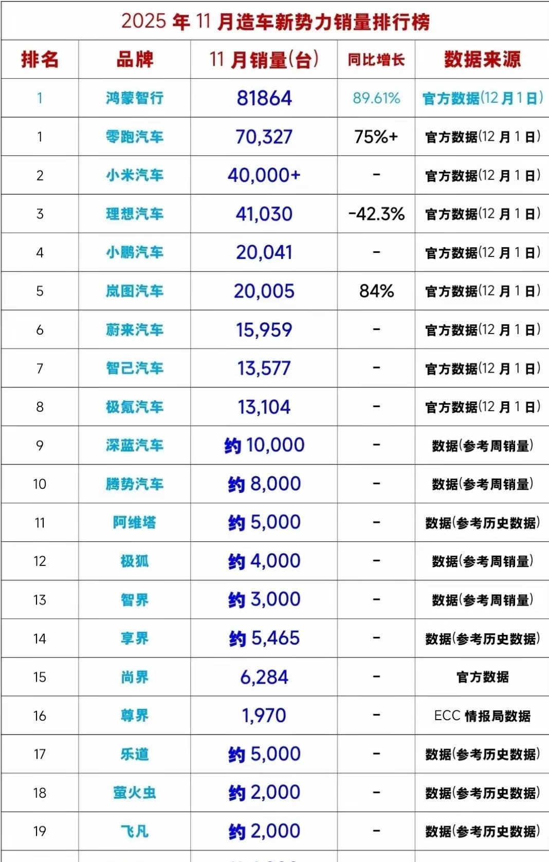 2025年11月新势力销量大洗牌:华为系8万+登顶,零跑逆袭破局,理想同比下滑42%!2025年11月造车新势力销量榜单正式出炉,市场格局迎来颠覆性重构!华为系鸿蒙智行以8万+交付量断层领跑,零跑汽车提前45天锁定年度目标,而曾稳居头部的理想汽车却遭遇同比42%的下滑,“几家欢喜几家愁”的剧情正在新能源赛道激烈上演。一、2025年11月造车新势力销量TOP15全榜单1. 鸿蒙智行:81864台(同比+89.61%),创单月交付历史新高,仅用43个月达成百万交付里程碑,成为新势力中最快达成该成就的品牌;2. 零跑汽车:70327台(同比+75%+),连续9个月保持增长态势,提前45天超额完成年度50万辆销量目标,盈利能力持续优化;3. 小米汽车:40000+台,连续三个月稳定突破4万辆大关,汽车业务实现单季盈利,全年剑指40万辆交付目标;4. 理想汽车:41030台(同比-42.3%),受竞品冲击及纯电转型阵痛影响,结束连续11个季度盈利态势,首次转亏;5. 小鹏汽车:30895台(同比+54%),海外市场月销突破5000台,单季度营收首破200亿元,毛利率创下20.1%的历史新高;6. 岚图汽车:20005台(同比+84%),单月销量首破2万台,实现连续10个月环比增长,央企背书优势凸显;7. 蔚来汽车:20575台(同比+28.9%),多品牌矩阵协同发力,第三季度亏损收窄31.2%,四季度冲击盈利目标;8. 智己汽车:13577台(环比+3%),爆款车型LS6持续发力,年度目标完成率达69.3%,稳步推进市场渗透;9. 极氪汽车:27011台(同比+106%),增速领跑行业,高端市场站稳脚跟,产品矩阵竞争力持续提升;10. 深蓝汽车:36026台(同比+122.97%),同比实现翻倍增长,黑马潜质彻底释放,精准定位撬动细分市场;11. 腾势汽车:约8000台,深耕高端MPV细分赛道,聚焦商务出行场景打造差异化优势;12. 阿维塔:11579台(同比+180%),增速迅猛,技术合作赋能产品力,市场认可度快速提升;13. 极狐:约4000台,依托核心技术背书,市场份额稳步爬坡,持续打磨产品体验;14. 智界:8983+台(鸿蒙智行子品牌),主力车型R7累计交付破10万台,成为华为生态下的重要增长极;15. 享界:5465台(鸿蒙智行子品牌),旅行车S9T首月交付4847台,新车型成功打开市场局面。二、销量背后的市场逻辑与行业变局1. 华为系成最大赢家,技术生态构建绝对壁垒鸿蒙智行以81864台的成绩实现断层领跑,核心得益于“全价位覆盖+技术深度赋能”的双重优势。其“界”系列矩阵已全面覆盖15万-100万元市场,问界M8、智界R7、享界S9等车型持续霸榜细分市场,30万元以上高端车型贡献了52%的销量,印证了华为高端化战略的成功。华为乾昆智驾系统的全面OTA、DriveONE动力平台的技术突破,以及鸿蒙OS跨设备协同的生态粘性,共同构建了竞品难以复制的技术护城河,43个月达成百万交付的速度更是刷新行业纪录。2. 格局重构:零跑逆袭,“蔚小理”分化加剧零跑汽车的逆袭堪称本月最大亮点,70327台的销量背后是60%核心部件自研的硬实力支撑,规模效应释放推动其实现连续季度盈利,同时海外市场正成为第二增长曲线。小米汽车则凭借生态红利稳坐第三,汽车业务首季盈利标志着其跨界造车已进入收获期。反观传统“蔚小理”,分化态势愈发明显:小鹏靠海外拓展和盈利能力提升实现增长,蔚来通过多品牌协同缩小亏损,而理想汽车受华为系等竞品冲击,叠加纯电转型期的产能瓶颈,出现销量下滑与盈利转亏的双重压力。3. 腰部品牌集体突围,存量市场拼精准定位岚图、阿维塔、深蓝等腰部品牌成为本月销量榜单的“增速先锋”,同比增速均超80%。岚图依托央企背书实现规模突破,阿维塔凭借深度技术合作快速起量,深蓝则以精准的产品定位撬动市场,它们的共同崛起证明,在存量竞争时代,仅凭价格战已难以为继,依托资源背书、技术赋能或细分场景深耕,才能在头部品牌的挤压下撕开增长缺口。4. 行业进入“硬功比拼”时代,消费者迎红利期11月的销量格局清晰表明,新能源汽车市场已从“野蛮生长”迈入“精耕细作”阶段。零跑的自研技术、鸿蒙的智能生态、小米的用户粘性,取代单纯的价格战成为破局关键。随着技术迭代加速和市场竞争加剧,行业洗牌将进一步提速,而技术普惠与规模效应将推动“高配置低价格”的消费红利持续释放,最终受益的将是广大消费者。2025年最后一个月,零跑能否向更高销量目标冲刺?华为系能否延续领跑势头?理想能否凭借纯电新车扭转颓势?欢迎在评论区分享你的看法!