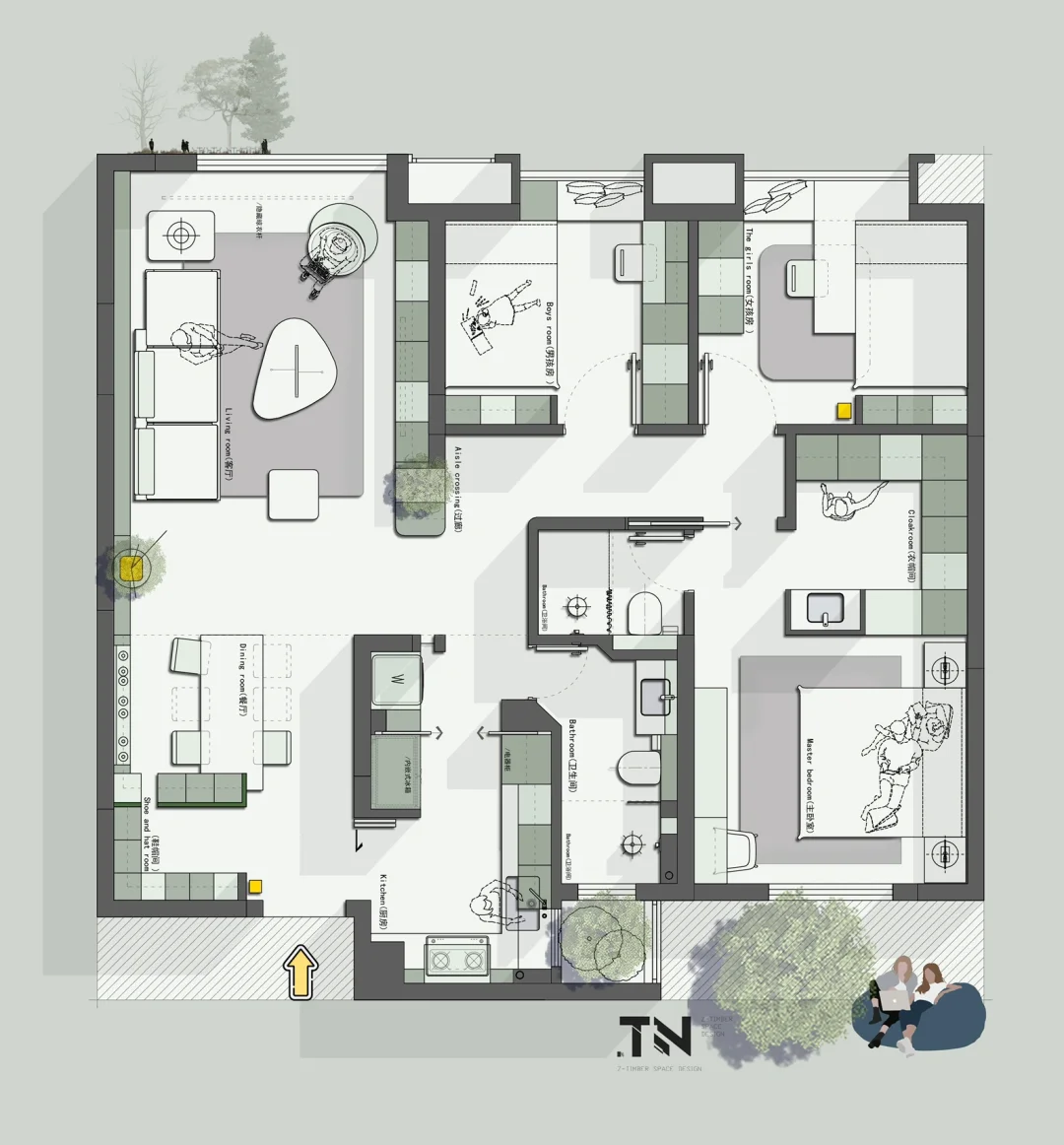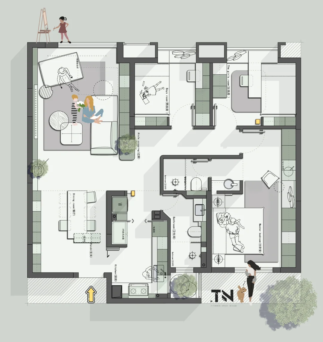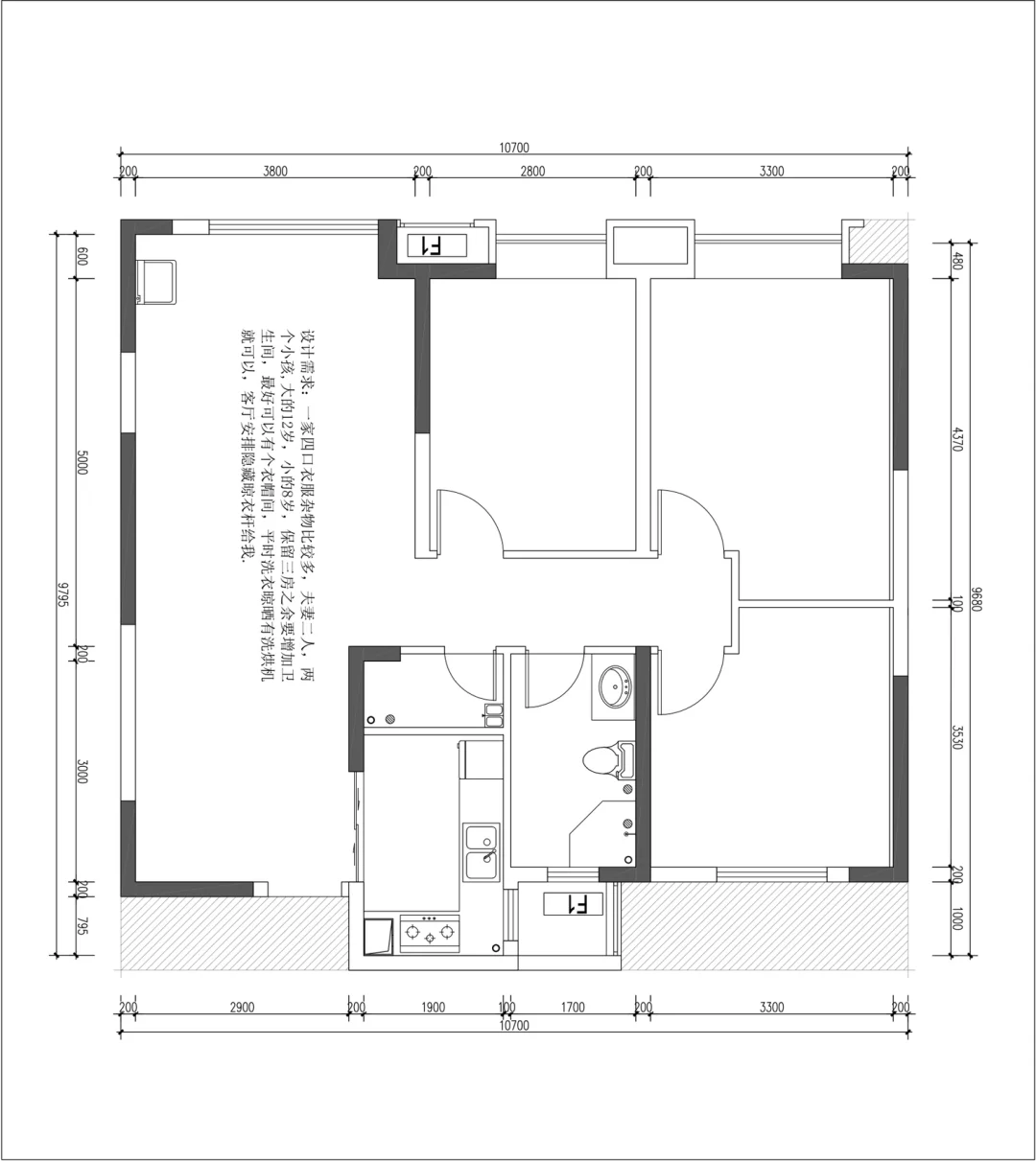 在人生的海洋中打拼疲惫之后,回到属于我的这个家,我们如何喜欢坐在客厅,客厅的这个舒适的窗户角落里,风平浪静,只有温情,只有安宁。 设计需求:一家四口衣服杂物比较多,夫妻二人,两个小孩,大的12岁,小的8岁,保留三房之余要增加卫生间,最好可以有个衣帽间,平时洗衣晾晒有洗烘机就可以,客厅安排隐藏晾衣杆给我。