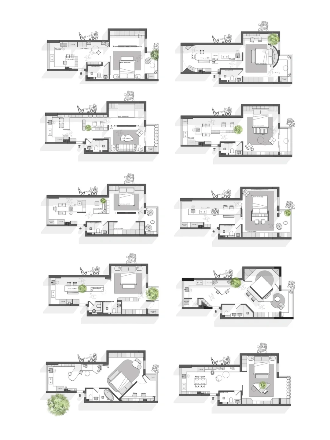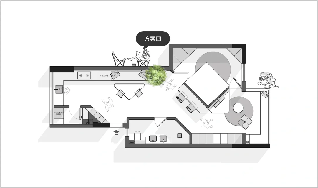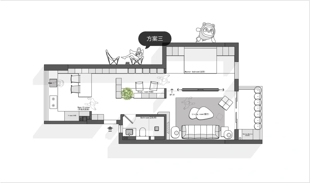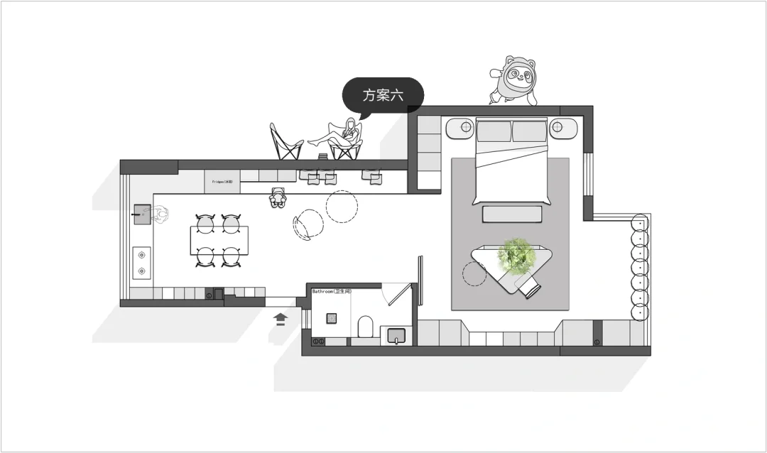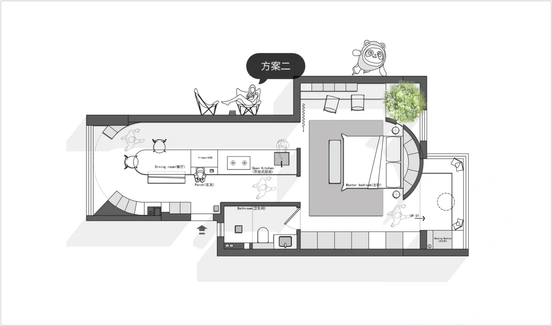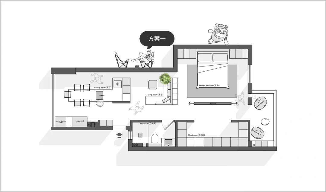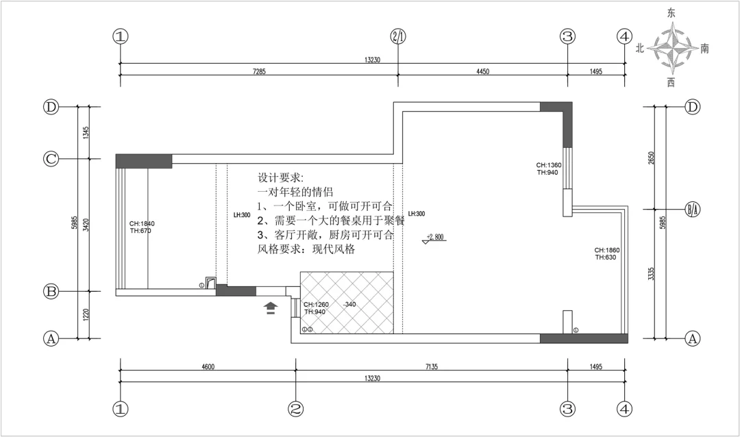 设计要求: 一对年轻情侣 1、一个可开可合的卧室 2、需要一个大餐桌做聚餐用 3、客厅开阔,厨房可开可合 风格要求:现代简约