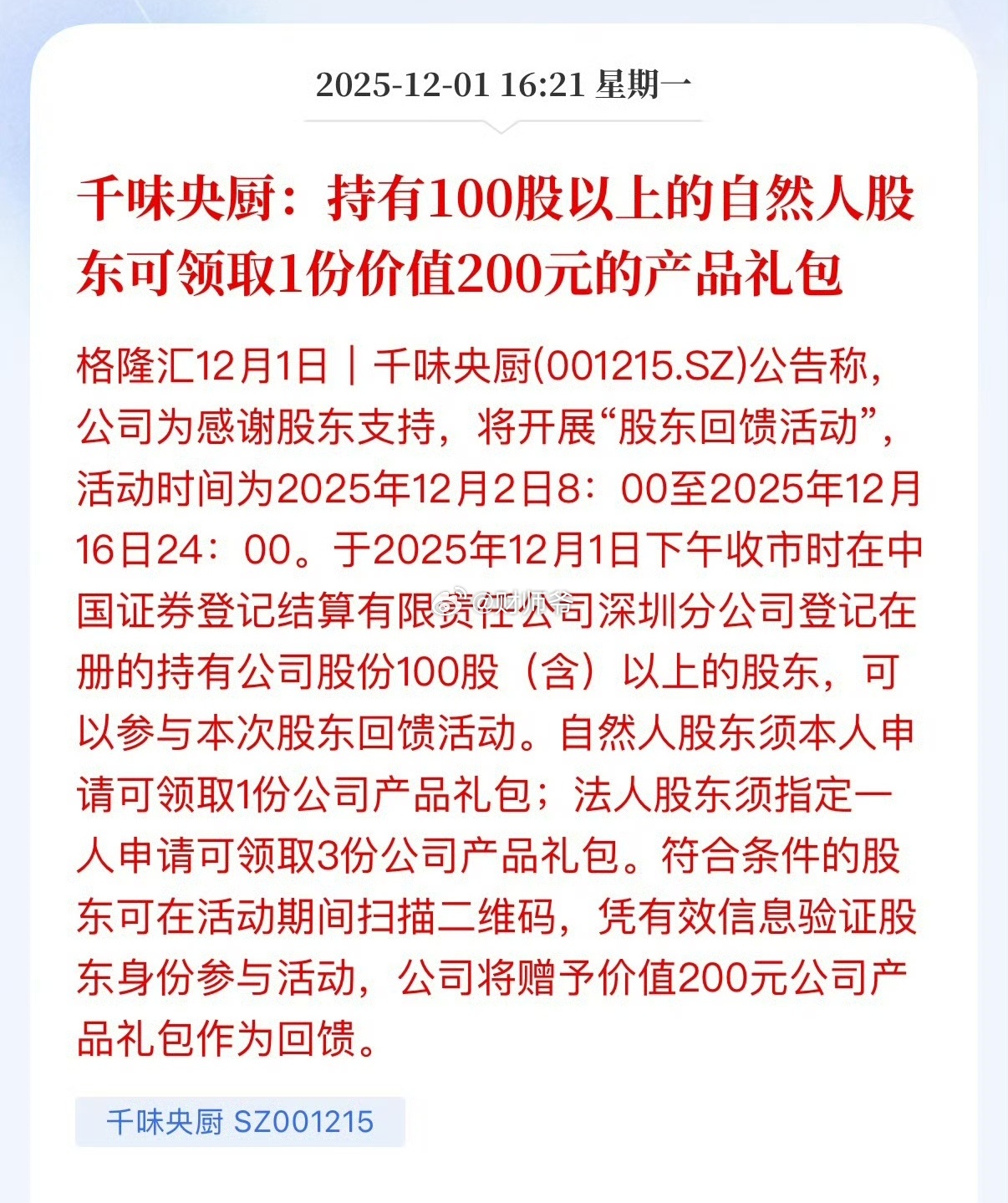 消费品上市公司们,一年一度的“给股东送礼”又开始了!这次【千味央厨】发了头车!