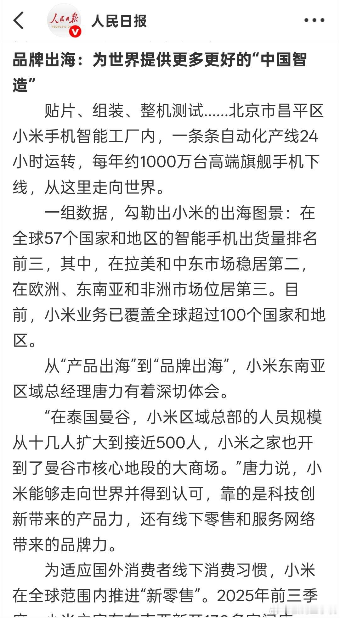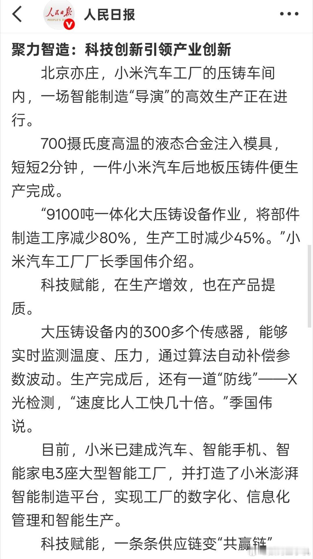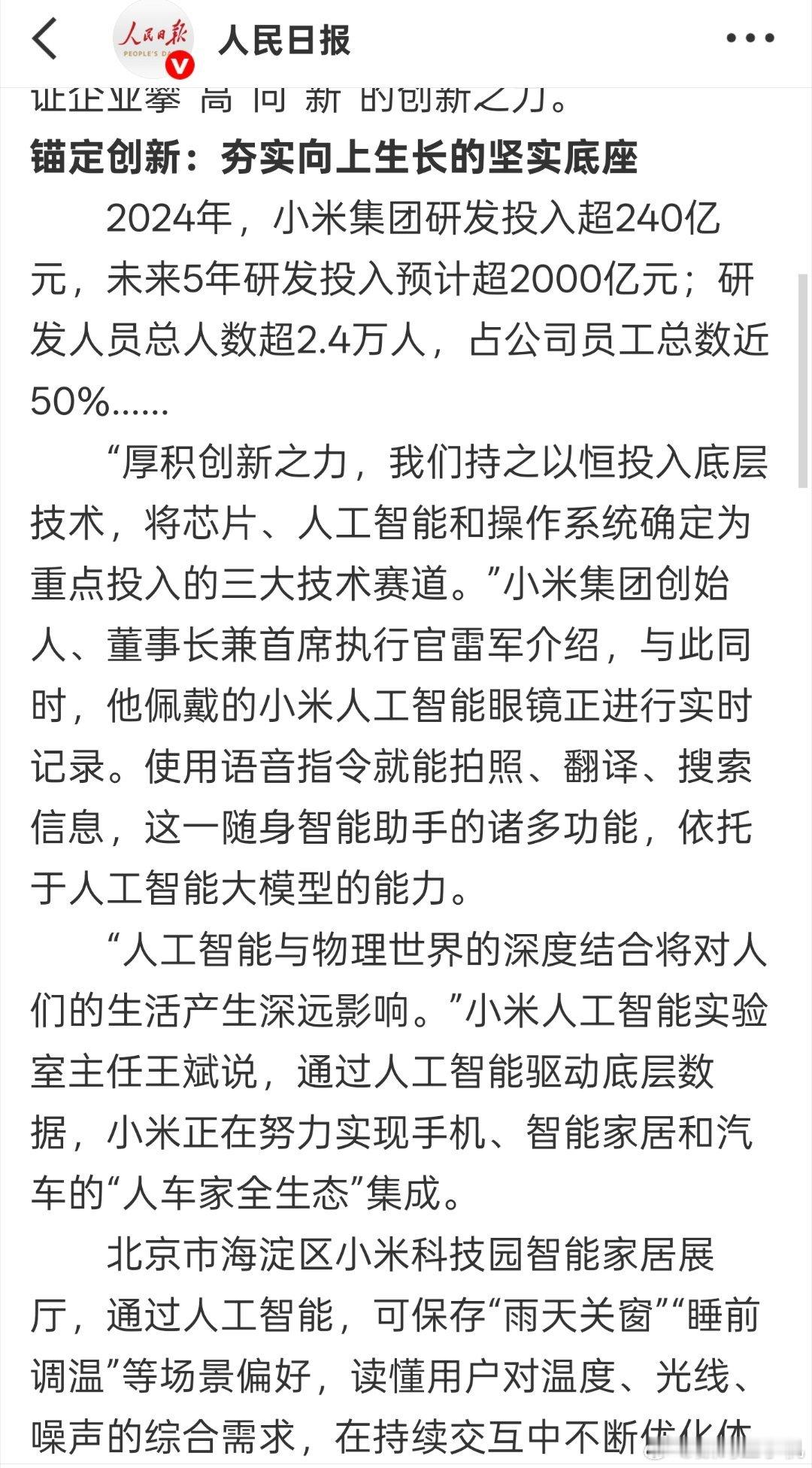 人民日报谈小米集团高质量发展我米又上电视了!凭借持续的科技创新投入与成果引发广泛关注,彰显中国企业自主创新决心,并且过去五年研发投入超千亿元,未来五年还将超2000亿,研发人员占比近50%,重视人才这方面非常重要,而核心技术方面,自研3nm制程芯片玄戒O1填补国内空白,还有6G、卫星通信等前沿领域亦有突破,人车家全生态布局成效显著,手机全球前三、IoT设备超10亿台、汽车19个月交付50万辆,这些都透露着超硬核科技企业的实力!通过澎湃智能制造平台联动200余家企业,推动供应链升级为共赢链,人民日报头版报道肯定其创新与品质,体现国家对企业技术自主的认可,我米正以有钱、有人、有决心的姿态,成为中国智造走向全球的中坚力量,继续加油,为国产品牌点赞!