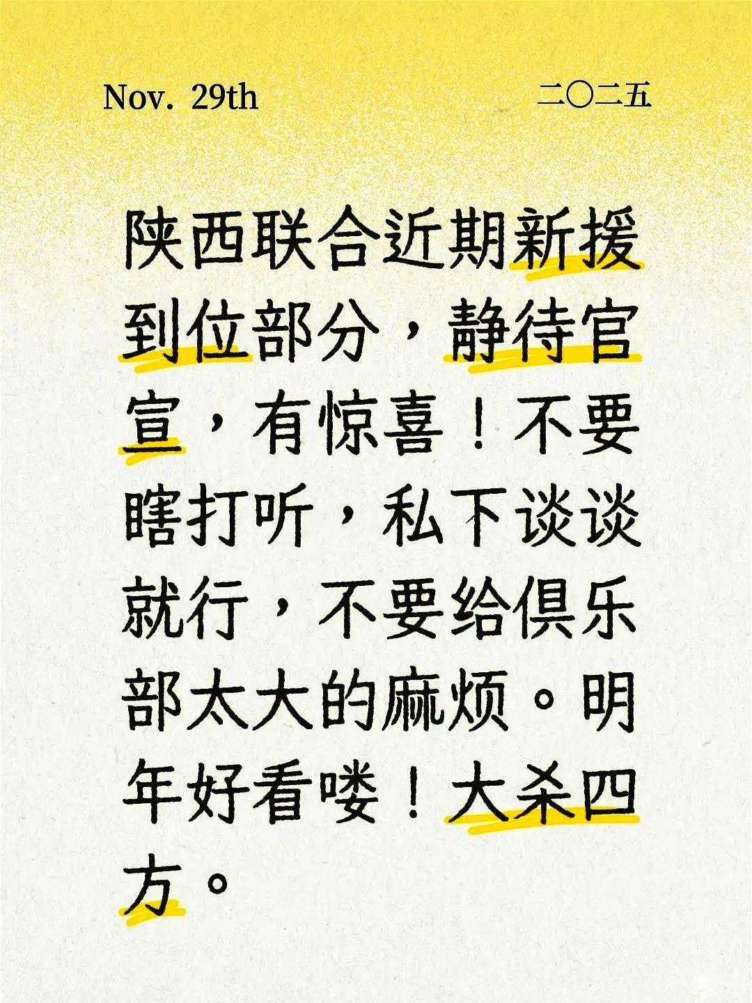 陕西联合近期新援到位部分,静待官宣,有惊喜! 这消息说明俱乐部引援工作进展顺利,且保密工作到位。球队和球迷之间形成了良性互动,不给官方添乱,体现了陕西球迷的成熟。这种“私下谈谈”的默契,恰恰反映出大家对球队新赛季的期待值拉满,也信任管理层的操作。 就该这么干,闷声发大财。球队踏实引援,球迷理智支持,这氛围就对了。中乙赛场竞争激烈,但陕西队这股劲头,摆明了是要冲着更高目标去的。明年主场气氛肯定炸裂,看好他们能成为一匹黑马,搅动整个联赛格局。