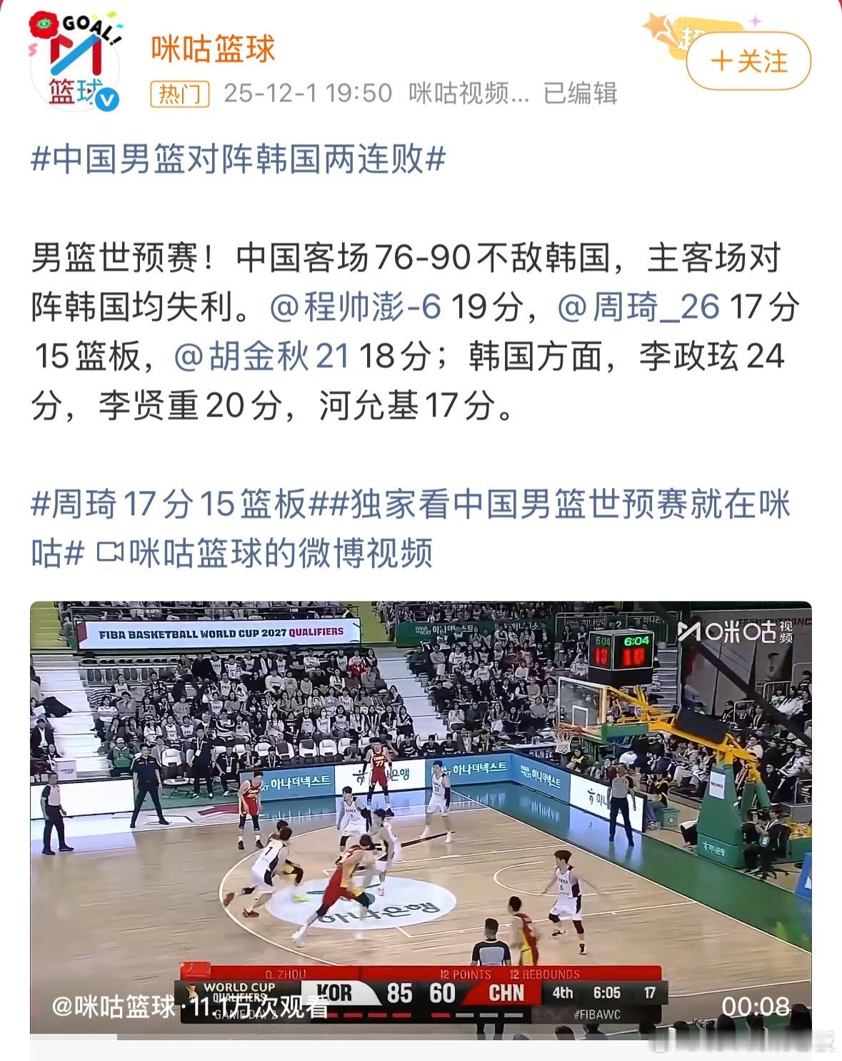 中国男篮对阵韩国两连败76-90客场惨败,四天内被老对手双杀,第三节最多落后32分,创下中韩交战史耻辱纪录!三分28投5中,除程帅澎外全队外线命中率仅4.5%,攻防两端全面拉胯。从亚洲杯四强到世预赛溃败,战术滞后、心态崩盘,这样的落差谁能接受?球迷怒了,男篮真的该醒醒了!