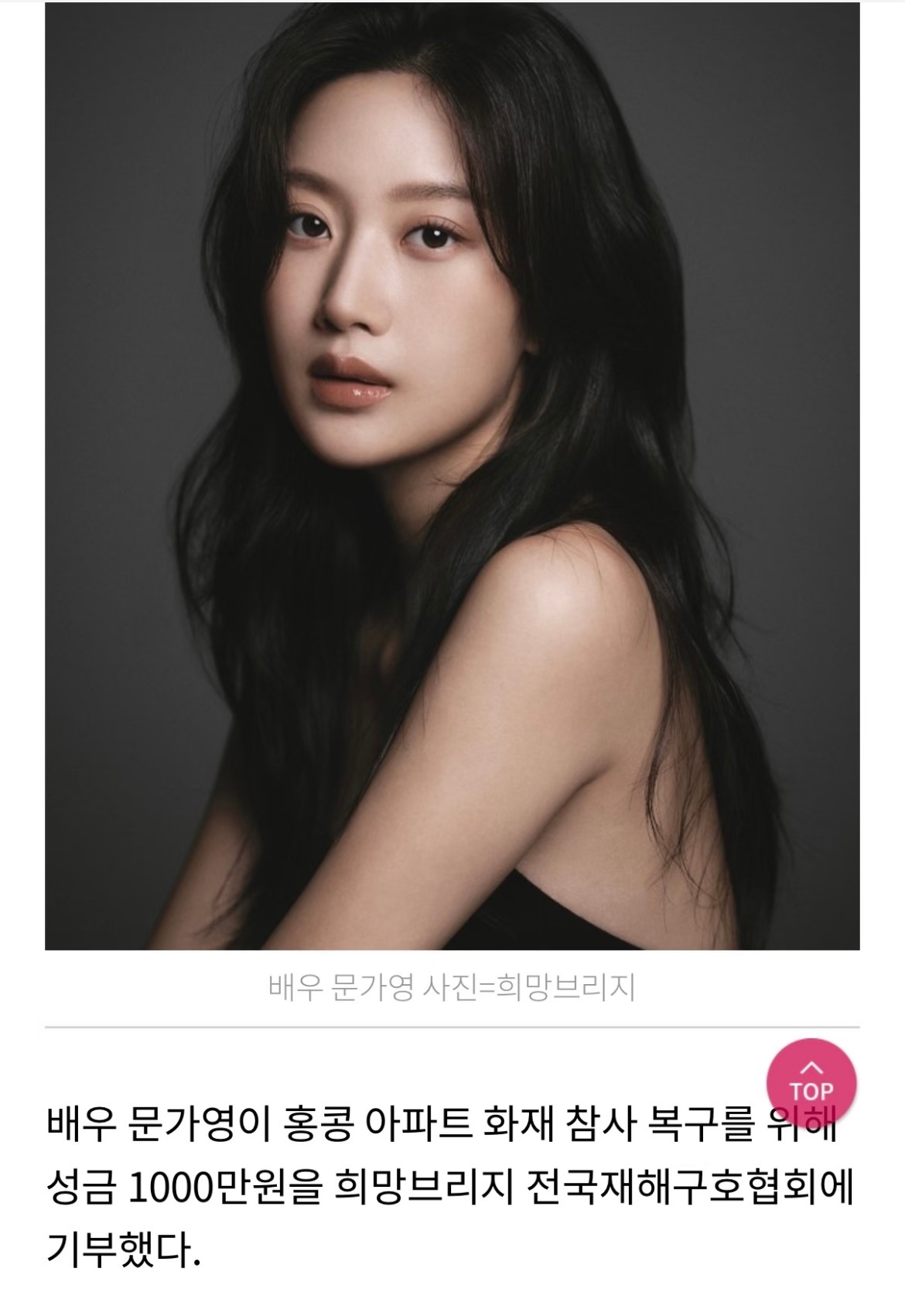 文佳瑛向香港捐赠1000万韩元2025年12月1日,希望桥全国灾害救助协会传来消息,演员文佳瑛捐赠了1000万韩元,这笔款项将用于支援中国香港公寓火灾事故的灾后重建工作。她还通过所属社表达慰问,称希望捐款能为受灾民众及家属提供些许帮助。依据2025年12月1日的实时汇率计算,1000万韩元折合人民币48232.29元,折合港元53122.08元。文佳瑛真的是人美心善!!
