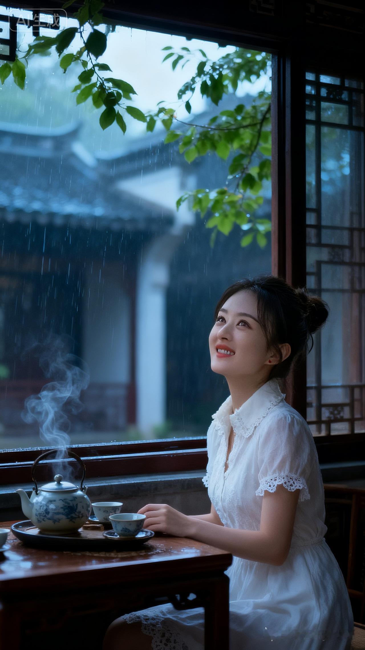 少女着简约穿搭,侧脸望向窗外开心笑意藏于眉眼,清新自然美丽。