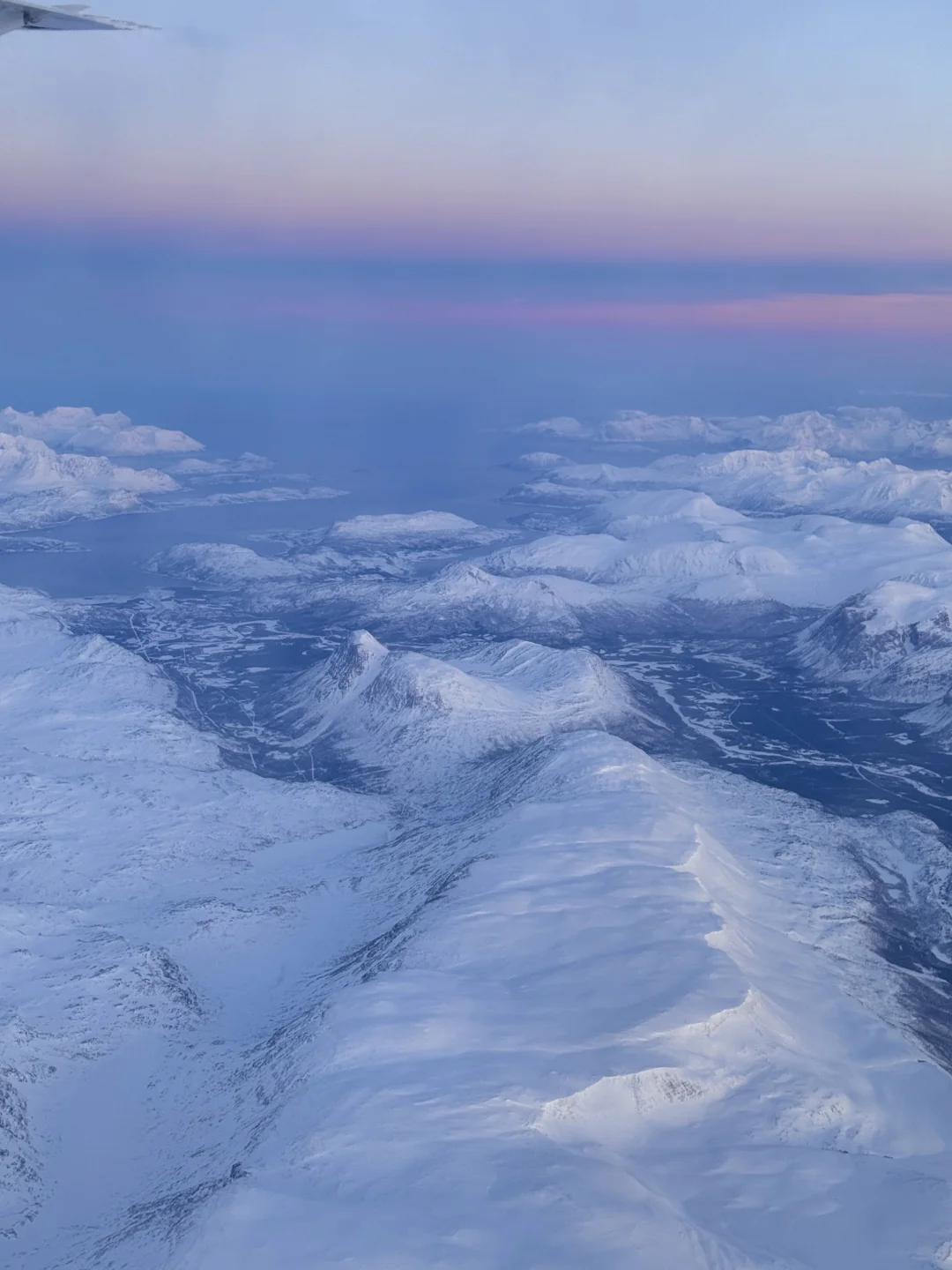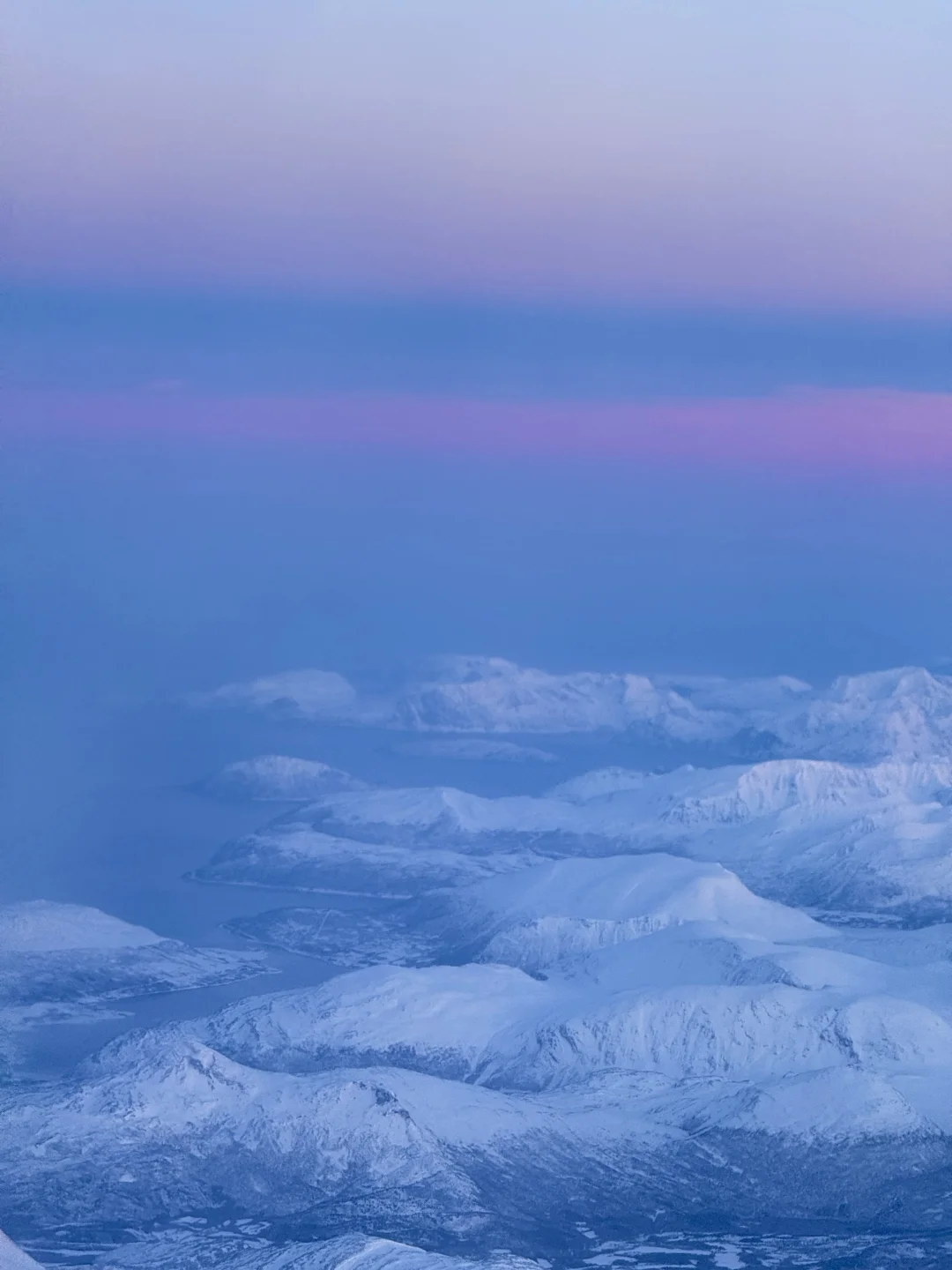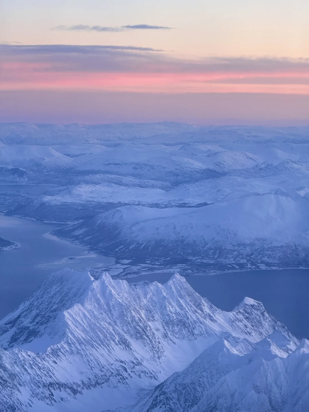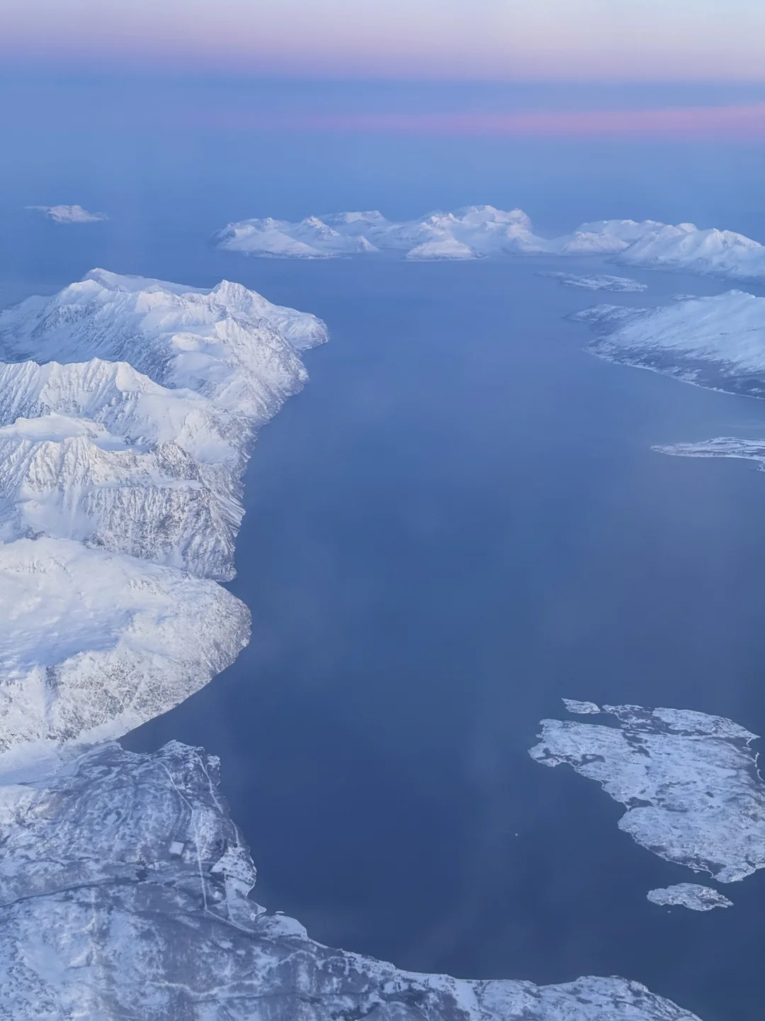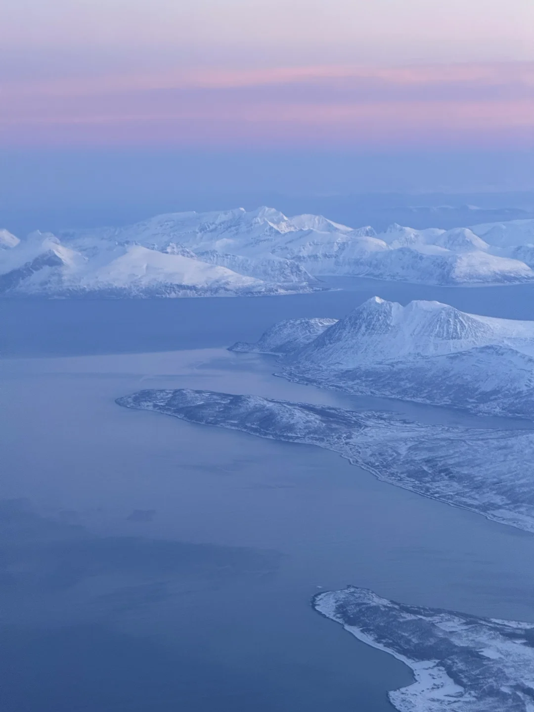 美得完全挪不开眼!!! 春节期间我从芬兰的罗瓦涅米坐飞机到特罗姆瑟 早班机本想抓紧时间睡一会 飞机起飞1h后 我彻底被眼前的景色震撼到无法闭上眼睛 蓝粉色的天空下 是极致的峡湾和连绵的雪山 感谢live帮我记录下此刻[哭惹R] . 摄于2025.1月 声明:所有图片均由本人拍摄