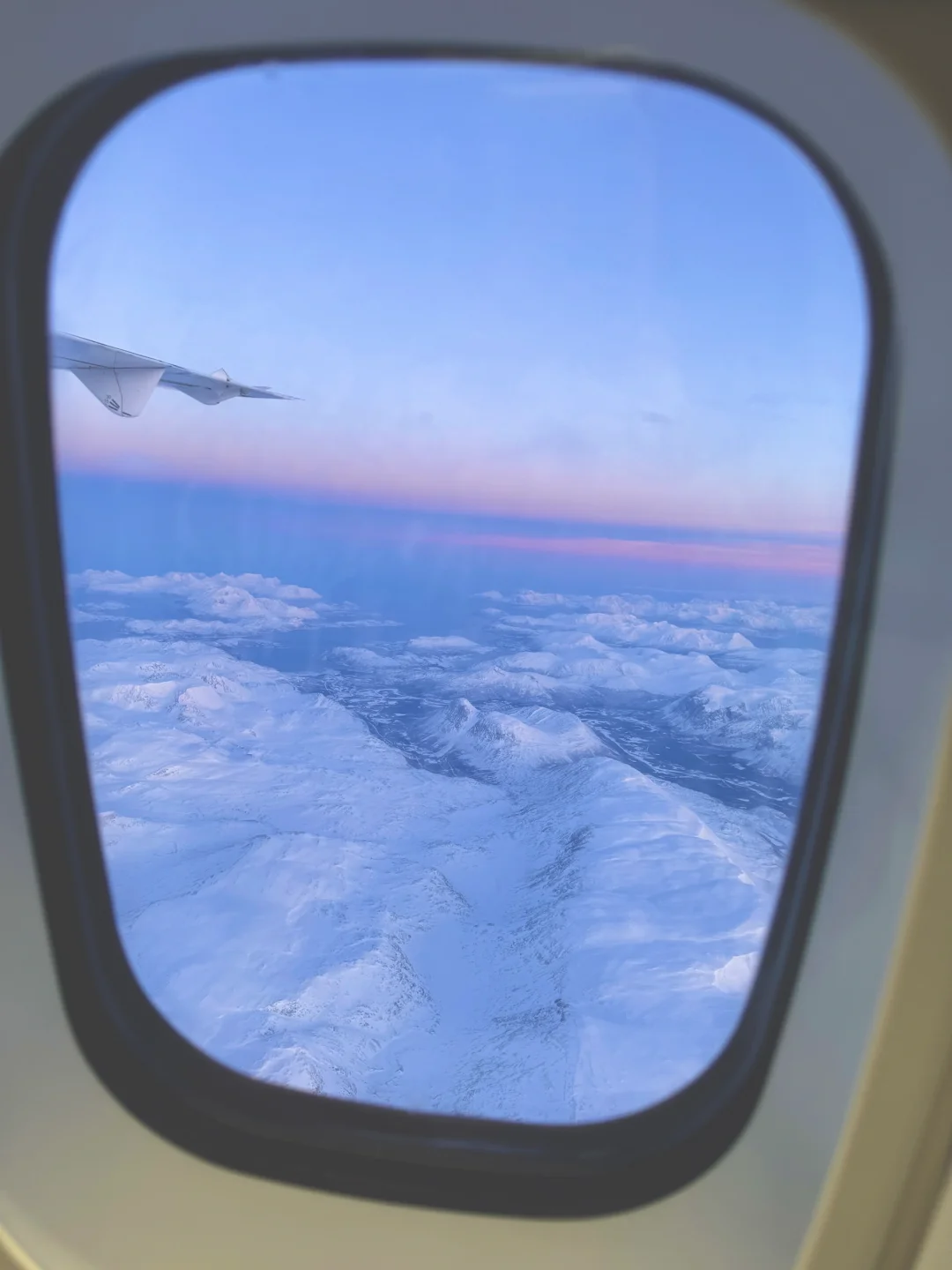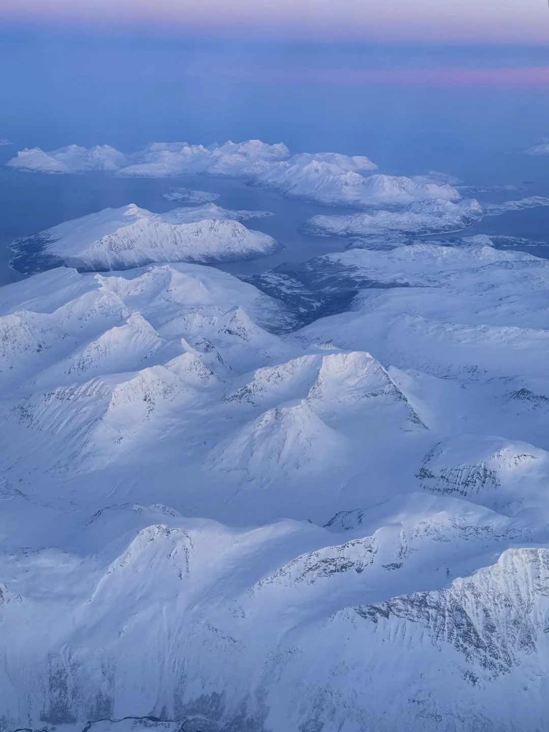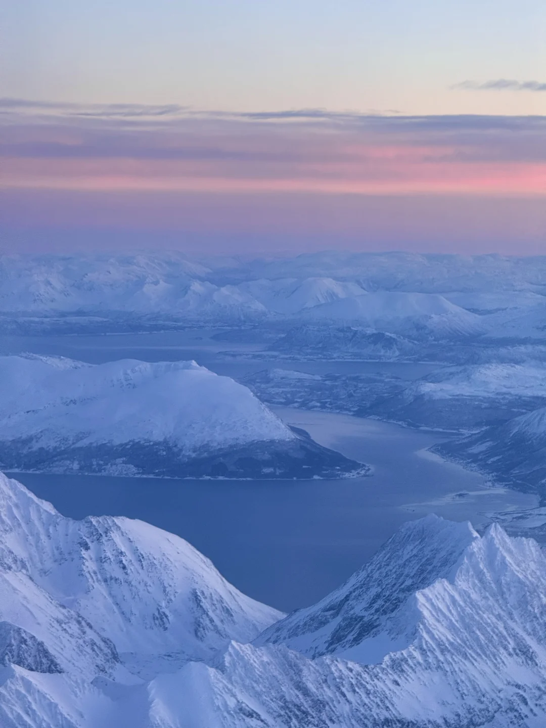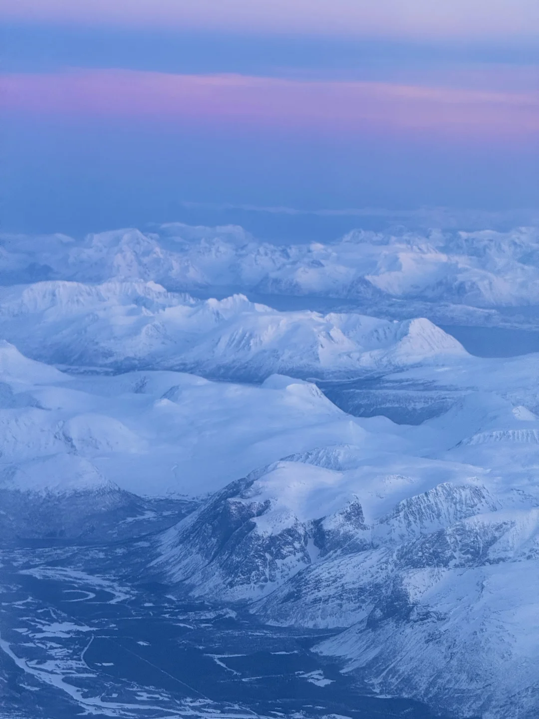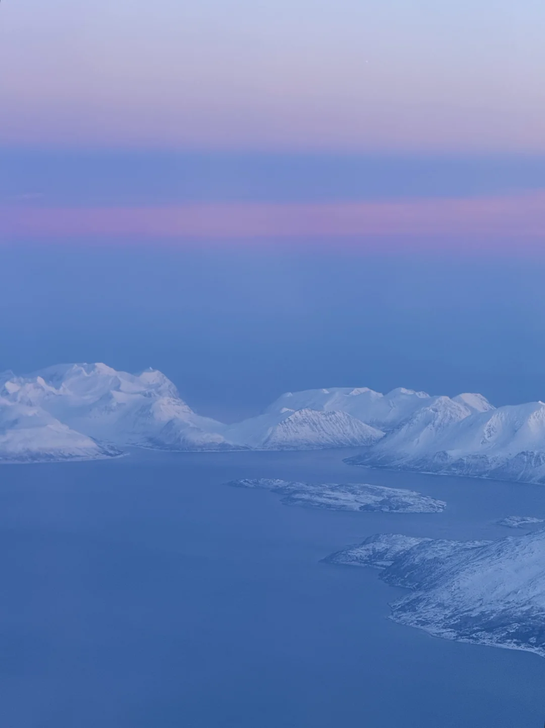 美得完全挪不开眼!!! 春节期间我从芬兰的罗瓦涅米坐飞机到特罗姆瑟 早班机本想抓紧时间睡一会 飞机起飞1h后 我彻底被眼前的景色震撼到无法闭上眼睛 蓝粉色的天空下 是极致的峡湾和连绵的雪山 感谢live帮我记录下此刻[哭惹R] . 摄于2025.1月 声明:所有图片均由本人拍摄