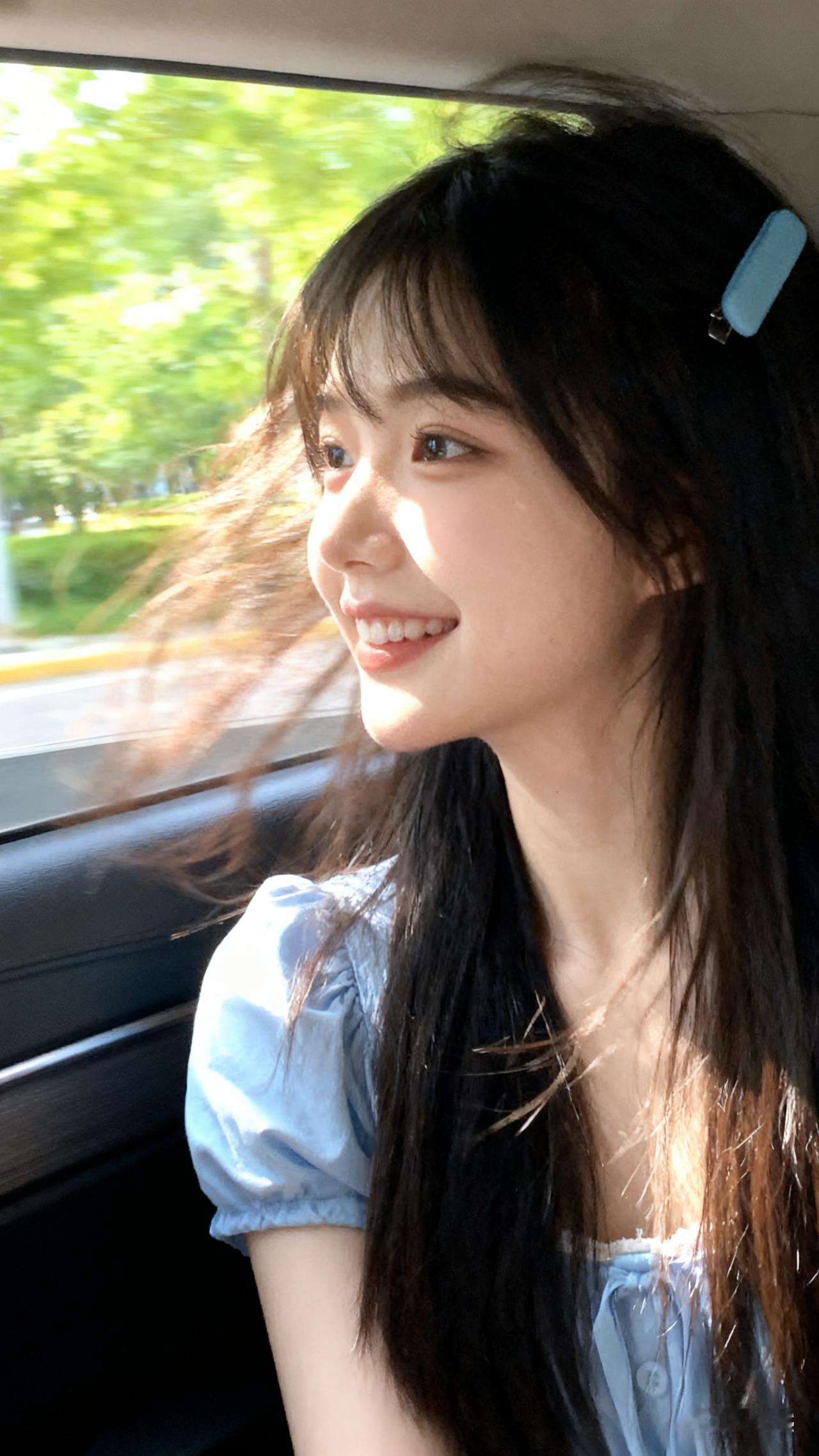 少女着简约穿搭,侧脸望向窗外开心笑意藏于眉眼,清新自然美丽。