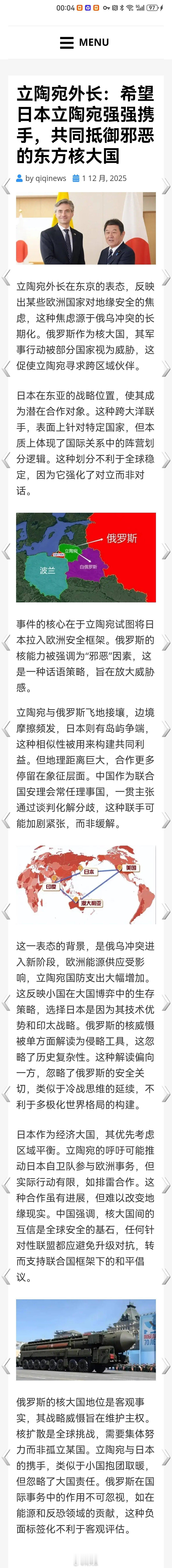立陶宛外长:希望日本立陶宛强强携手,共同抵御某核大国。日本国宝级歌手喊话高市爽快