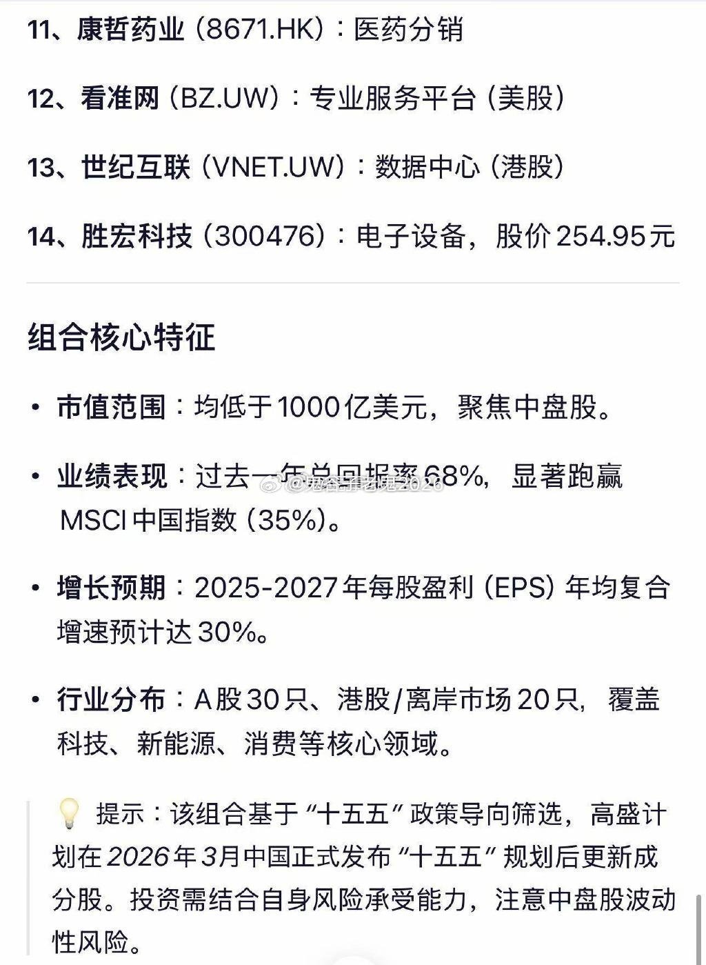 2025年11月18日,高盛发布《中国股市“五年规划”:高盛“十五五”投资组合重磅推出》研报,推出“十五五”投资组合,精选了50只中国中盘股。其筛选标准包括市值上限1000亿美元;2025-2027年预期EPS年化增速≥20%,且过去3年研发、资本开支强度高于市场平均;除新兴行业未盈利企业外,PEG不超过2.5倍;营收兑现能力强,机构买入评级占比高,重视股东回报;A股、离岸市场各占50%等。