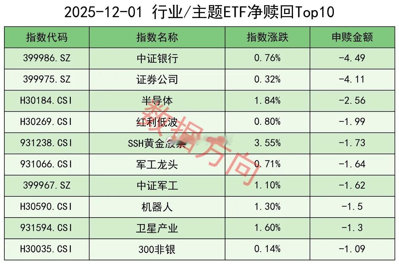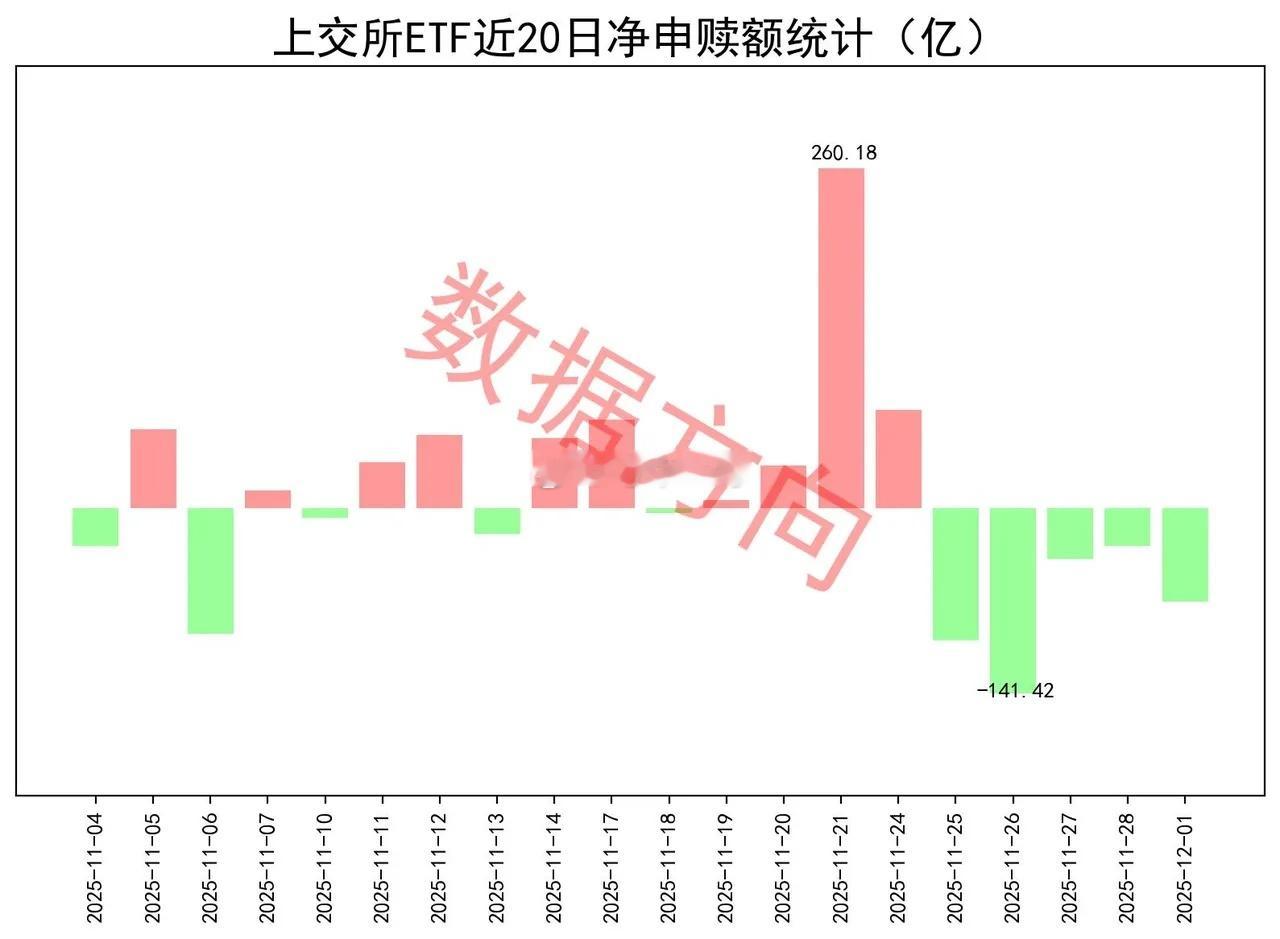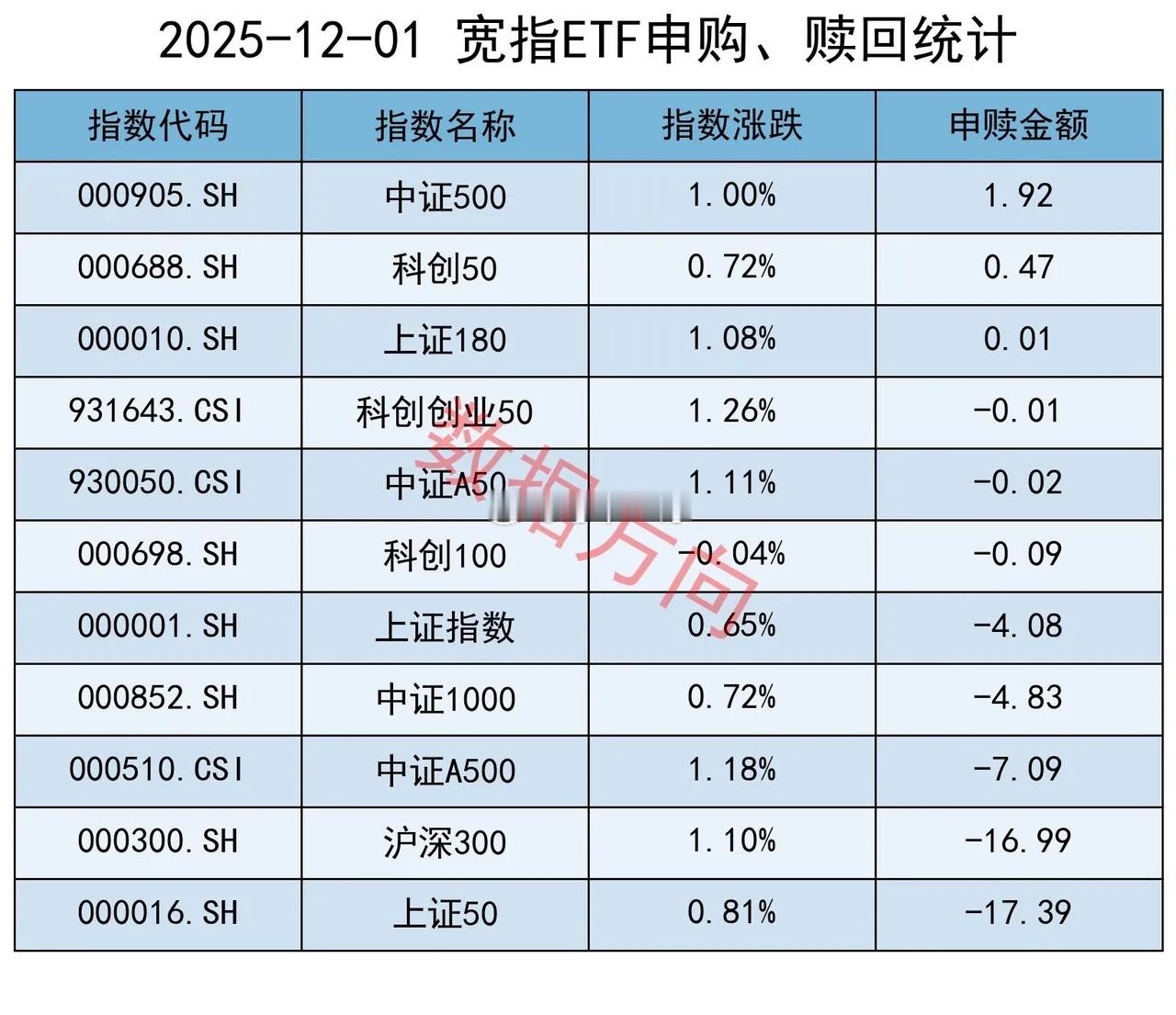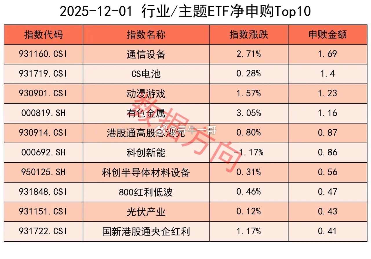 上交所ETF连续5天净赎回!12月1日星期一,大盘放量上涨收获开门红,有色金属、智能手机涨幅居前。上证指数涨幅0.65%,上交所ETF合计净赎回71.02亿元。这是连续第5天净赎回。宽指中证500指数(1.92亿)、科创50指数(0.47亿)、上证180指数(0.01亿),分别获小幅净申购。上证50指数(-17.39亿)、沪深300指数(-16.99亿),双双净赎回超过15亿。中证A500指数(-7.09亿),净赎回超5亿。中证1000指数(-4.83亿)、上证指数(-4.08亿)、科创100指数(-0.09亿)、中证A50指数(-0.02亿)、科创创业50指数(-0.01亿),分别被小幅净赎回。行业和主题 CS电池指数(1.4亿)、科创新能指数(0.86亿)、光伏产业指数(0.43亿),一起进入申购榜。港股通高股息港元指数(0.87亿)、800红利低波指数(0.47亿)、国新港股通央企红利指数(0.41亿),一起进入申购榜。其他进入申购榜的还有:通信设备指数(1.69亿)、动漫游戏指数(1.23亿)、有色金属指数(1.16亿)、科创半导体材料设备指数(0.56亿)。中证银行指数(-4.49亿)、证券公司指数(-4.11亿)、300非银指数(-1.09亿),一起进入赎回榜。军工龙头指数(-1.64亿)、中证军工指数(-1.62亿)、卫星产业指数(-1.3亿),一起进入赎回榜。其他进入赎回榜的还有:半导体指数(-2.56亿)、红利低波指数(-1.99亿)、SSH黄金股票指数(-1.73亿)、机器人指数(-1.5亿)。ETF