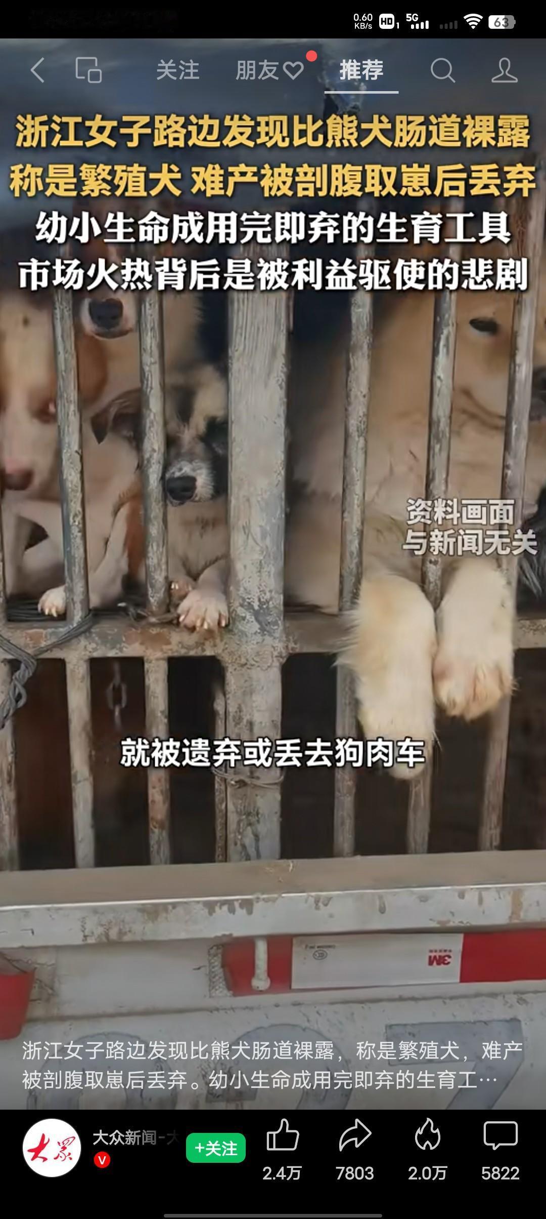 怎么能有人可以这样的狠! 浙江一女子在路边发现一只比熊犬肠道裸露在外,伤势惨不忍睹。知情人吴女士称:经警方调查,这是附近犬舍的繁殖犬,在难产时被剖腹取崽,老板觉得它活不成,伤口都妈处理就把它抛弃了。幼小生命成为用完即弃的生育工具,市场火热背后是被利益驱使的悲剧。 许多人都想买只毛孩子来陪伴自己,又有谁知这火热市场的背后,是被利益熏心罪恶的开始。宠物舍里有多少繁殖的小动物,它们被关在狭小拥挤的笼子里不停生育,身体垮了,品种不时兴了,就被遗弃或被送进狗肉馆。 近亲繁育的折尾,是被遗传性心肌炎等先天性疾病的折磨,成了活不久的“星期猫”甚至有部分黑心商家,给猫狗打催情针割声带,无序逐力的背后,是行业缺规范监管有漏洞,繁育者唯利是图,而规范行业行为,兼顾动物基本福利,即能既保护消费者权益,又能让行业走的更远。