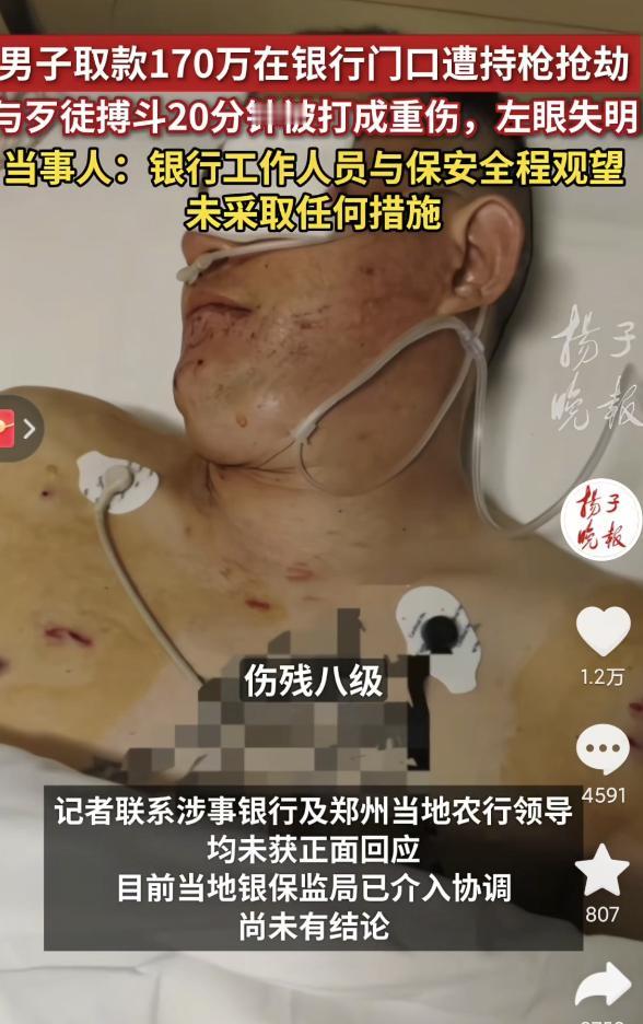 出内鬼了?河南,男子取款170万在银行门口遭持枪抢劫,银行工作人员和安保只是全程围观还没报警,最终男子被打了一枪,重伤二级! 2024年7月2日,倪先生在某银行某支行想要取自己的170万现金,因为在银行取款都需要提前的预约,所以他也和银行打过招呼了。 谁能想到,当他取好钱之后,把这些钱都装进了自己的皮箱里,刚要出门口,就遭到了持枪抢劫。 接着他们俩就在门口互相的缠斗,你来我往的,一共纠缠了20多分钟,可是在这个期间,银行的工作人员还有保安全,都没有人进行阻止,只是在门口看着他们打,甚至连报警都没有。 其实我很能理解,这些工作人员还有保安,感觉工资并不值得自己为之搏命,毕竟对方还带着自己的手搓枪,但是连报警都没有,我觉得这个就非常的过分了,这20分钟已经足够警察过来了。 这些钱都是男子的辛苦钱,所以他拼尽全力保护着,最终这个歹徒没有抢走,只能骑着摩托车逃跑了。 但是在争斗的过程中,倪先生受伤严重,尤其是脸更是重伤,左眼已经失明了。 最终被鉴定为重伤2级,八级残疾,当天这个歹徒王某就被抓到了,后来被判了死刑,缓期两年。 后来根据王某交代,他是做生意失败了,然后期货亏损的非常厉害,所以就想在银行蹲点,然后抢钱。 后来倪先生想要提出38万民事赔偿,但是仅判获了7.3万元,而这笔钱也恰恰只够他自己的医药费。 他想去找银行,认为他们在工作上的冷眼旁观存在着很明显的失职,但是对方的领导一直在推诿,一直也没有什么下文。 根据民法典,银行对经营场所及周边储户负有安全保障义务,而且这个案子就发生在银行的门口,他们是有这个义务提供安保的,所以他们是存在过失,也应该承担相应的责任。 有的网友疑惑:“大额取款都要提前预约,怎么那么巧就刚好赶到那天,应该消息泄露了,每天银行那么多人,怎么就抢的那么准,内部有人?” 对此,大家有什么看法呢,听说过类似的事情吗? (信息来源:扬子晚报)