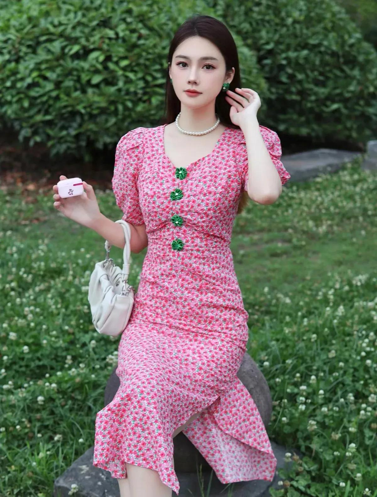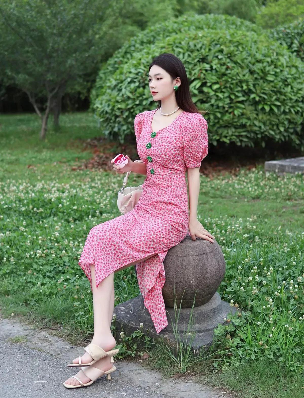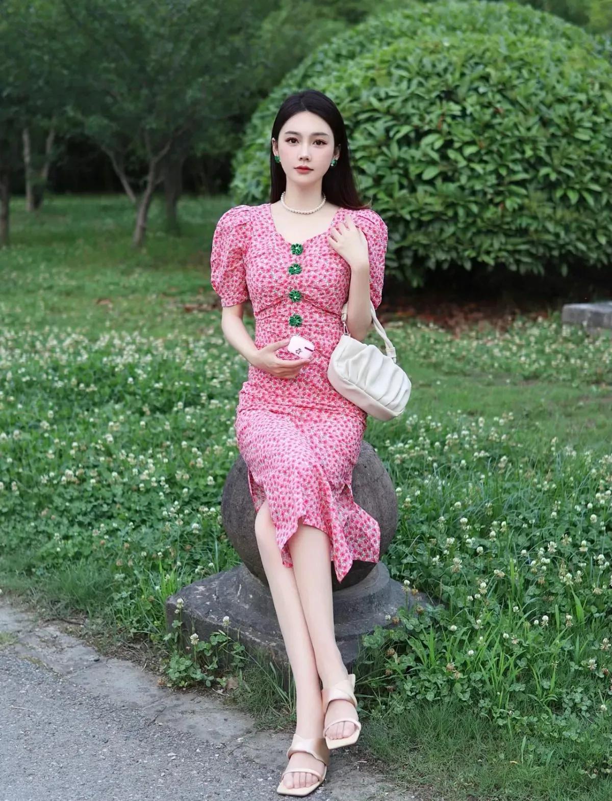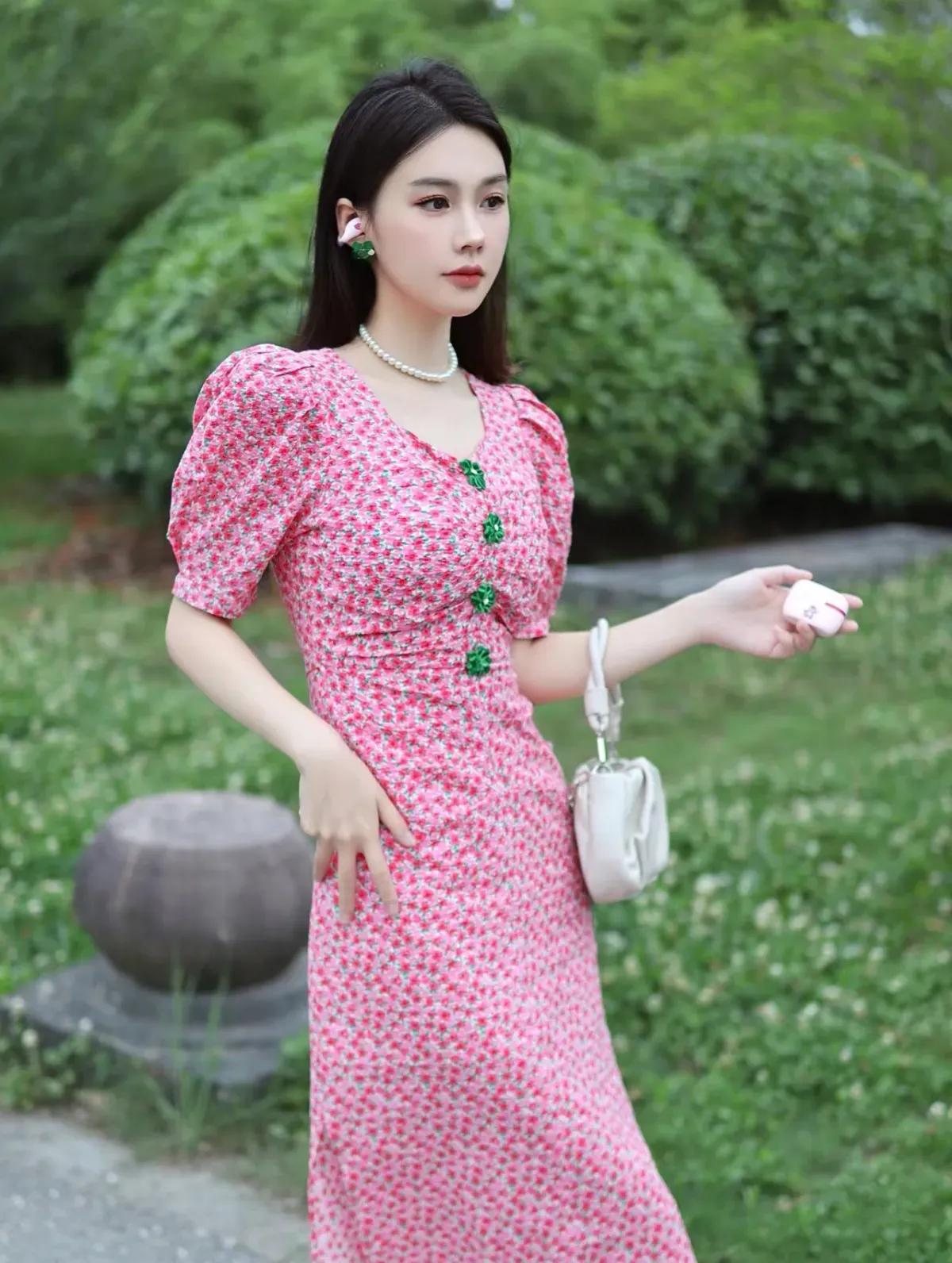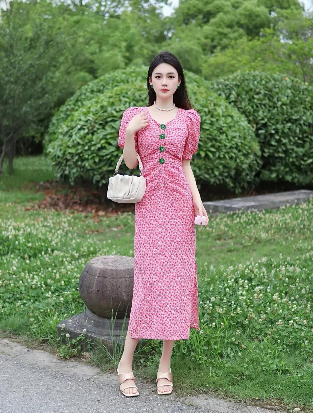 这套穿搭是甜美复古的春日碎花风,清新又具少女感。粉色碎花长裙自带春日氛围,泡泡袖+收腰设计凸显少女感,裙身的绿色装饰扣是点睛之笔,中和了粉色的甜腻,增添复古精致感;开叉裙摆让行走更灵动,适配户外场景。 米白色褶皱包柔和简约,与裙装风格呼应;裸色凉鞋舒适清爽,不抢裙装风头,让造型更显轻盈;珍珠项链+绿色耳饰与裙装装饰扣呼应,强化了搭配的精致度。碎花连衣裙 如何穿搭会具有少女软妹感 粉色系