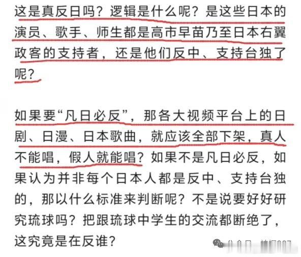 【是时候大规模清除日本文化了!】最近几天,一些日本艺人在中国的演出活动被大规模中止:——滨崎步的演唱会已经卖出1.4万张票,舞台都搭好了,突然宣布不能开演;——日本歌手大槻真希正在台上演唱《海贼王》的片尾曲,舞台灯光突然全灭,接着被请下台;——《工作细胞》和《蜡笔小新:炽热的春日部舞者们》发行方工作人员表示"临时接到通知",决定撤档,部分影院下架了相关电影的预售场次;《鬼灭之刃》虽然已经上映,但处境也比较艰难,退票人次很高,超过了130万;《初吻》、《昨日青春》等影片,目前也没有确切的档期信息,上映计划已陷入停滞;……我就知道,这些事情出来以后,肯定有一些傻叉和“理中客”要跳出来。我就曾关注一个一天到晚自诩为“理中客”的人就不理解了,提出:这是真反日吗?逻辑是什么呢?是这些日本的演员、歌手、师生都是高市早苗乃至日本右翼政客的支持者,还是他们反中、支持台独了呢?然后,他又提出疑问:难道去听滨崎步的演唱会,去看宫崎骏和蜡笔小新的电影,中国人就会变成亲日派?就会数典忘祖?难道禁绝这些文化产品,这些演员、歌手和动漫从业者就有意愿和能力倒逼高市早苗下台?还有一个著名大V写了一篇《日本歌手在上海唱了一半被中断,这是打击东京吗?》,说道:上海作为中国最开放、繁荣的城市,我愿意相信,上述情景只是一个孤例,它在上海不具有代表性。希望这种情况之后不再发生,也希望全国其他地方能够避免类似过激表现的发生。然后,这篇文章“违规”被删后,他又写了一篇文章,换了思路继续做“理中客”,从经济利益角度分析这种做法“不划算”,他这样说道:中国演出公司违约和前期准备的投入都会产生代价,上海市和交通部门也减少了一块消费,部分从外地已经提前赶到上海的观众扑了空,还有大量已经购票的人,特别是准备从外地去上海的人被打乱了周末计划。这些合在一起都是中方的损失。至于网络上的傻叉就更多了,有些说,这么做说不定哪个小公司就倒闭了、搭建场地的民工就拿不到工钱了……我们今天就和大家说说这些问题。有人疑问:这种做法真的是反日吗?是这些日本的演员、歌手、师生都是高市早苗乃至日本右翼政客的支持者,还是他们反中、支持台独了呢?是,这些歌手、演员之类的没有公开自己是否是高市早苗或日本右翼政客的支持者,但是我可以这么说,绝大多数都是,因为前几天日本FNN和产经刚做了全国性的民意调查,高市早苗的支持率飙升到75.2%,相反前日本首相石破茂却被日本人网暴,称之为“日奸”!石破茂为什么被日本人网暴?为什么被骂成“日奸”。因为石破茂公开批评了高市早苗的行为。11月13日,石破茂在事件后首次发声,表示他不赞同高市发言,他这样说道:“自1972年中日邦交正常化以来,日本历届政府都在小心翼翼地维护对华关系。尽管偶尔难免情绪高涨,难免想说一些不该说的话,但最终都能谨慎处理。”他因此怀疑,如今的高市内阁,是否真的如她所说延续了日本政府的一贯立场。23日同一档节目中,石破茂继续批评高市说:“外交场合不是用来过嘴瘾,也不是用来提升支持率的。相反,即便被选民骂得狗血淋头,也要为国家利益做应做之事,这才是我们一直接受的教育。”前几天,我们在《高市早苗就是一个三流政客》这篇文章里面就说过了,高市早苗就是一个三流政客,因为它把个人利益凌驾于国家利益、政党利益和资本利益之上了。现实往往是很讽刺的,那些把国家利益放在首位的人往往得不到太多普通老百姓的支持。相反,那些利用民粹伤害国家利益的人往往会获得更多的支持。这就足以说明一点:普通老百姓的认知是极其低下的,更不要说对极其复杂的国际政治的理解。不仅仅是日本普通民众,中国也是如此。我们不说别的,日本与中国有着血海深仇,但是你看看去日本旅游的中国游客达到了多少?每年去日本旅游的外国游客达到了3000万人,而中国就“贡献”了1000万人——疫情期间,中国赴日游客大幅度降低,疫情过后赴日游客逐渐增加,今年1-9月,赴日游客已经达到749万人次,(按照原本的趋势)全年将超1000万,创历史新高。高市早苗喊出“台湾有事就是日本有事”后,又有多少人取消了去日本旅游呢?我可以肯定的说,如果不是国家强制性的出台一些政策,很多傻逼是不会取消行程的。即使国家通过一些或明或暗的方式让旅行社“主动”取消了赴日团体游,即使国有航空公司主动大幅度取消了日本航线,但你知道吗,仍有4成以上的个人游还在继续。你信不信,如果不通过强制手段或极端手段,那些定了滨崎步演唱会的傻逼没有几个会主动退票的,因为那些傻逼压根不懂什么政治,它们愚蠢的脑袋只会考虑自己的眼前利益!对于那些傻逼,你和它讲道理,它是听不明白的,就算听明白了,它也会把个人利益放在首位的。这就是为什么众多外国企业敢肆无忌惮的伤害绝大多数中国人民族感情的主要原因!这样的例子已经发生太多太多次了。——2019年的时候NBA在香港问题上恶心中国,CCTV5都停播了NBA,结果一些傻逼球迷还是挤爆了球馆;——2021年,美国以莫须有的罪名对新疆产业进行打压,耐克加入了抵制新疆棉花行列,几乎所有的明星都与耐克解除了合同。然而,耐克做了一场“折扣好货立即选购”的活动,在售卖之前就有33.7万傻逼预约,然后一秒售空;你以为日本的企业