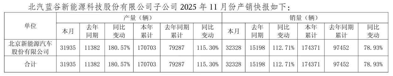 北汽蓝谷这是要支棱起来了?!11月产销数据炸裂[哆啦A梦吃惊] 11月产量:31935辆 同比暴涨180.57% 11月销量:32328辆 同比劲增112.71% 累计产量:17.07万辆 同比增长115.30% 累计销量:17.44万辆 同比增长78.93% 要知道,北汽蓝谷之前的日子可不算太好过,这波强势反弹,你觉得能持续吗?来评论区聊聊~
