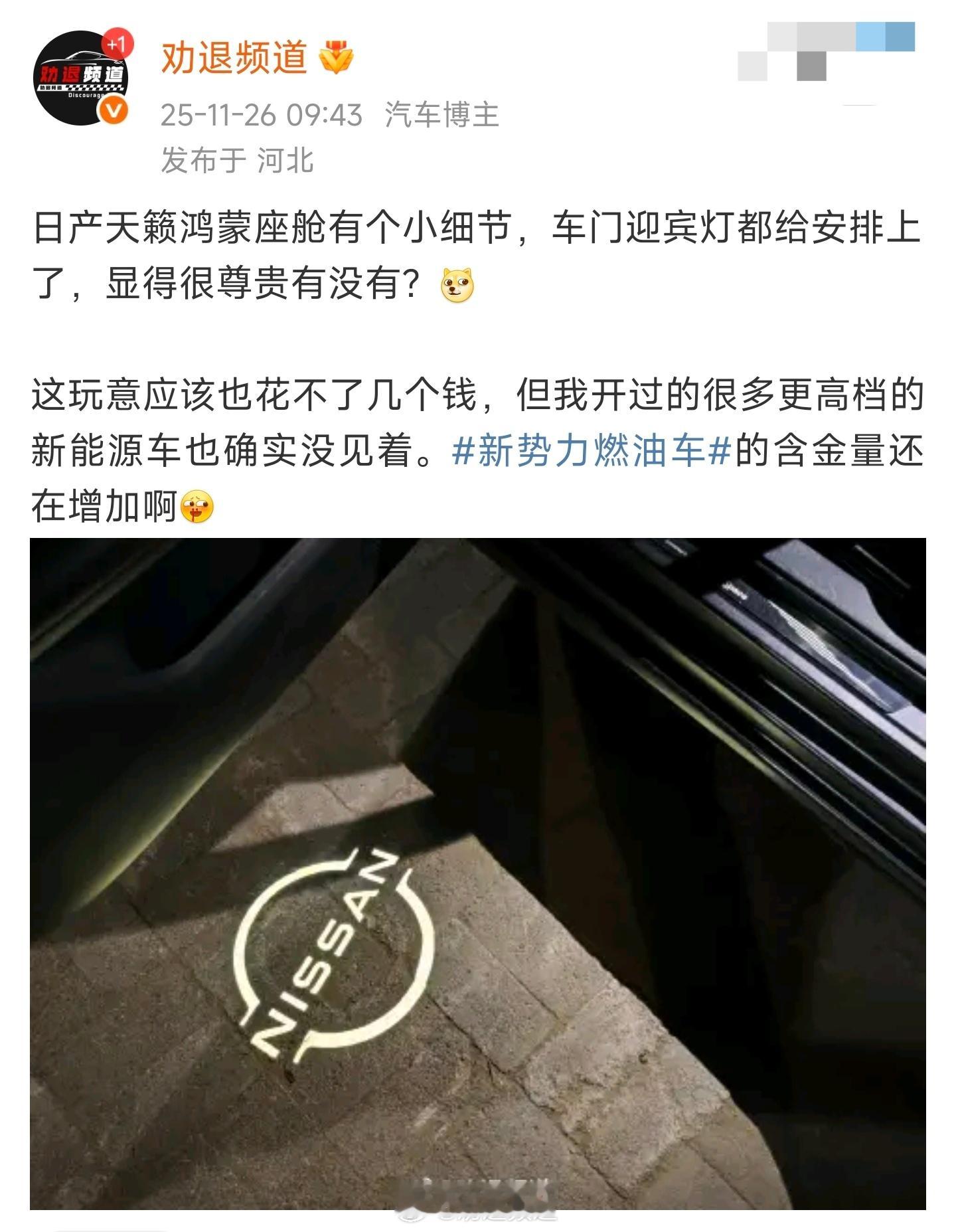 我上次夸了日产天籁鸿蒙座舱的车门迎宾灯,结果发现N6也有,而且也是动态的……这可是顶配才12万多的车啊,都能这么玩,太牛了