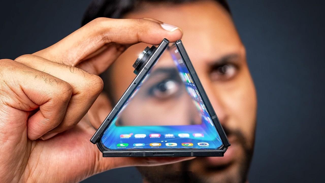 三星三折叠发布 三星三折叠真的来了……但它的折叠形态和华为三折叠存在着区别,是像叠被子一样向内折叠两次。这就导致三星三折叠只有两个折叠态,不得不「两次展开」。