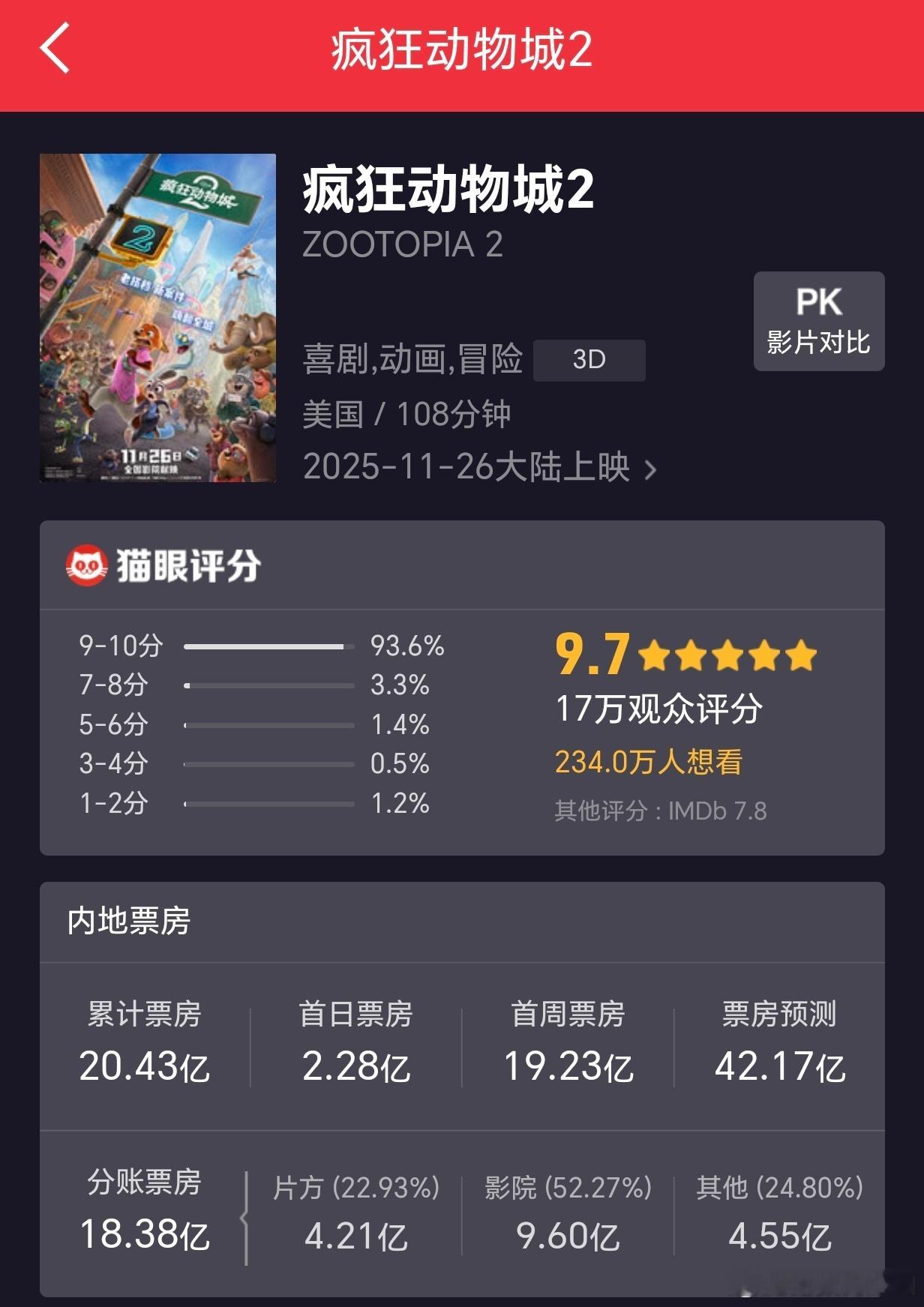 疯狂动物城2,才上映7天票房就20.43亿了,预测票房更是干到了42亿。我去,多久没看到好莱坞电影,在国内这么火了?兔子警官人气是高啊年初还有哪吒2,今年影院真是二次元动画续作的天下。