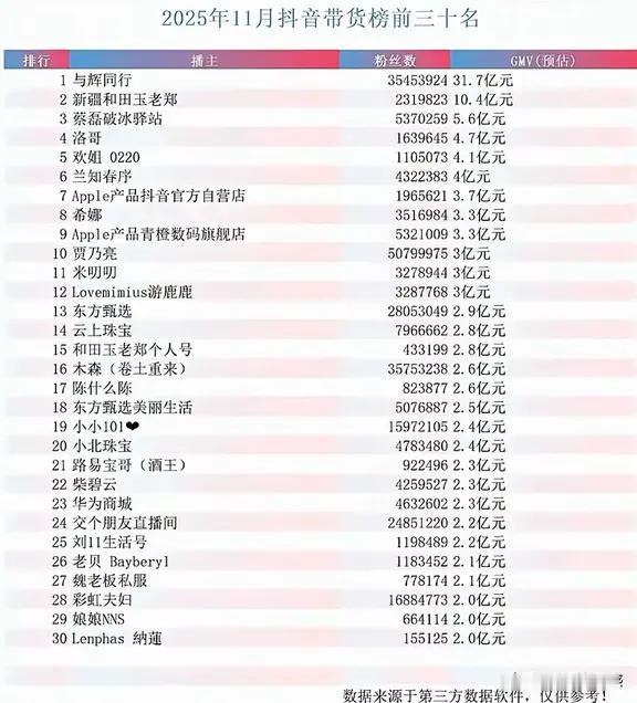 昨天是十二的第一天, 就惊艳开场, 与辉同行迎来了开门红。 全天销售业绩7250万, 人气峰值9.7万, 账号涨粉5.8万。 小兰兰优秀, 又是凭一己之力虐“投部”的一天。 直播八小时, 销售业绩1750万, 账号涨粉2.1万。 哈哈哈, “投部”四大家族, 销售情况回归正常, 600+400+200+200, 合计1400万。 11月份抖音带货榜出来了。 与辉同行以31.7亿元的GMV稳占榜首,和第二名的10.4亿元相比, 是遥遥领先。 前三十名里面, 小兰兰排名第四。 这个第四名就有点含金量, 因为每天只直播八小时, 还是双休, 键盘侠服不服起? 最“漂亮”的账号上了榜, “大拇指”也上了榜, 虽然都没进前十名, 但是好歹也算是“头部”了。 据不完全统计, “投部”四大家族11月份业绩同比去年上涨了, “大拇指”累计约2.6亿, “食指”累计约2亿, “中指”累计约9000万, “无名指”累计约9300万, 四个指头累计销售业绩估计7亿左右。 当然, 这些数据都是大约的, 数据不是很标准。 11月份已经结束了, 12月份换了领导班子, 大老板开始发力, 至于结果如何, 大家拭目以待。 散会! 董宇辉