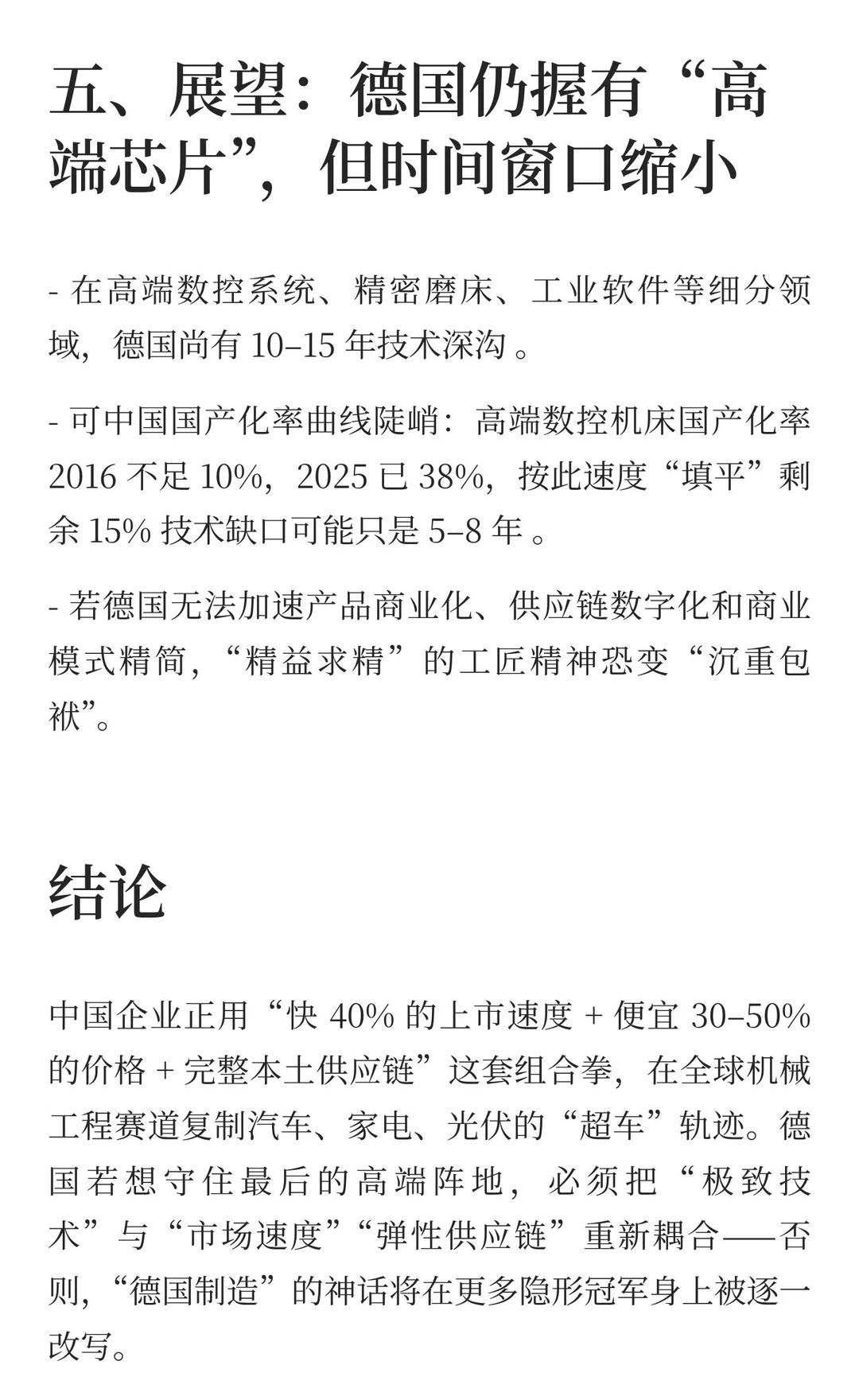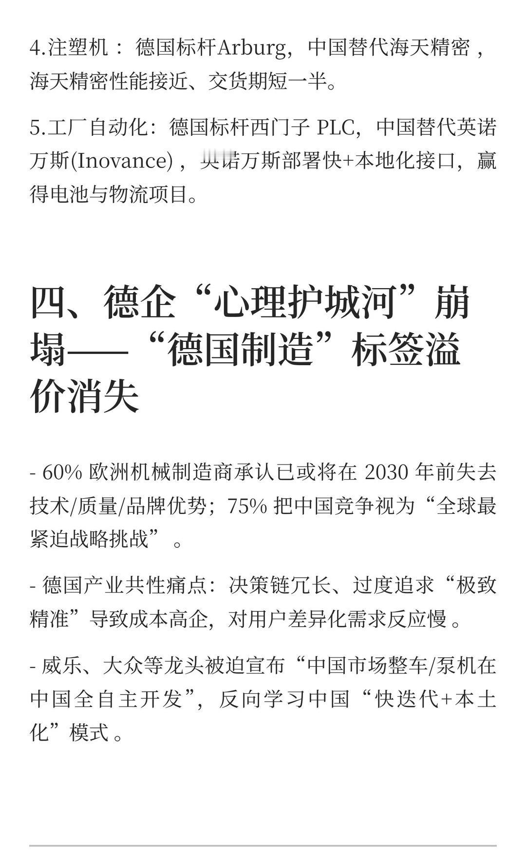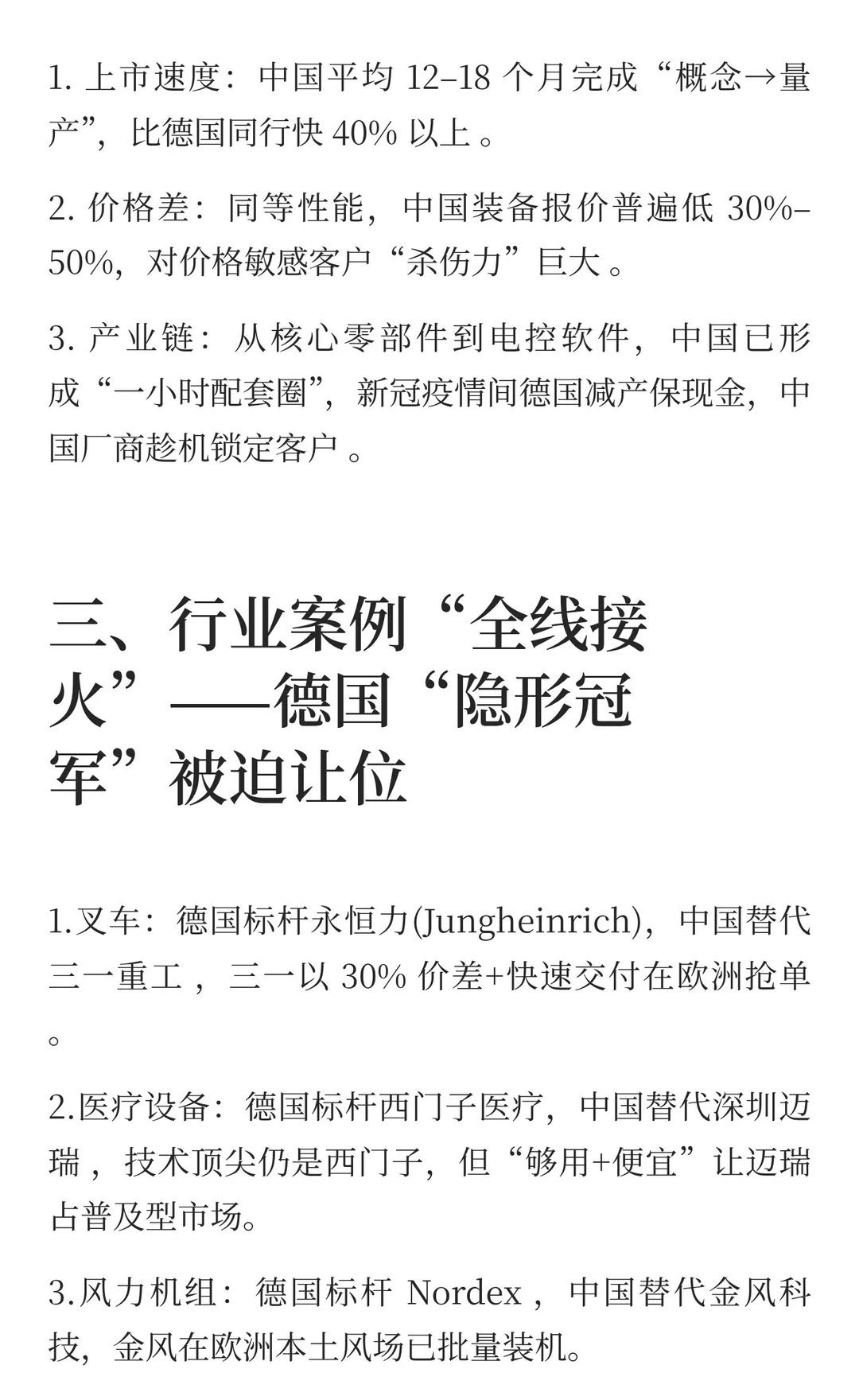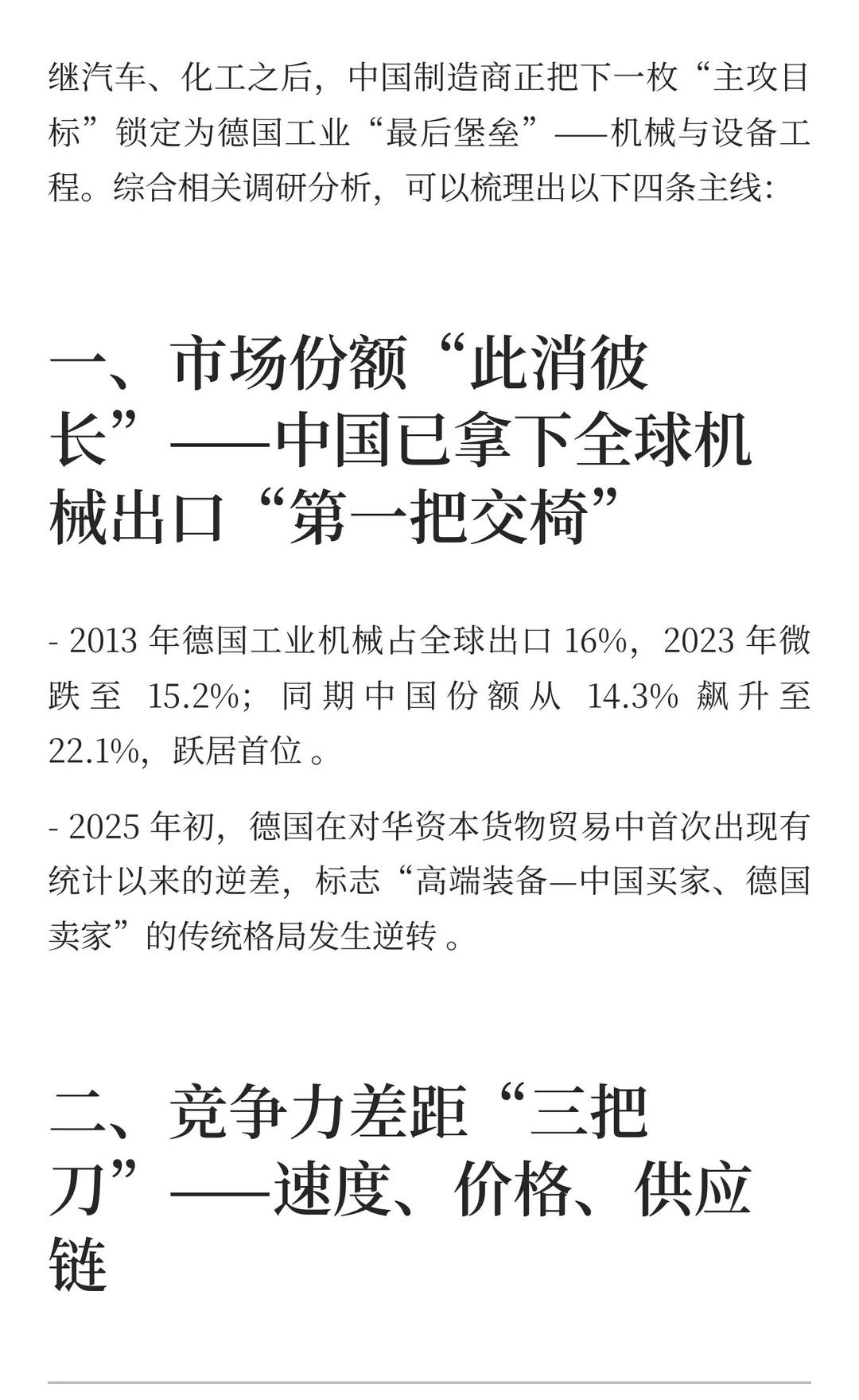 中企正在主攻德国工业最后堡垒,德变局加速 中国制造商正通过快速上市、低价和完整供应链,迅速抢占全球机械工程市场,尤其在叉车、医疗设备等领域替代德国品牌。德国若不加速产品商业化、供应链数字化和商业模式精简,高端制造优势将被削弱,德国工业4.0可能变德国工业404。 中国制造 从中国制造到中国创造 中国制造彰显中国力量 工业 机械 机械设备 战略性新兴产业德国工业 德国工业4