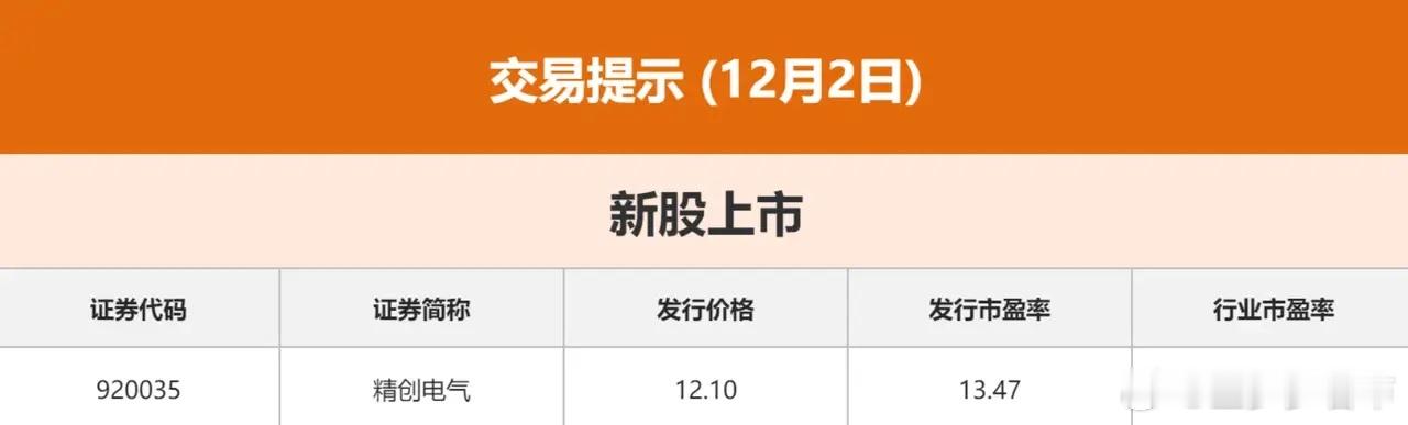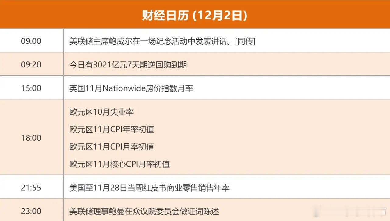 12.2股市早知道:1、外盘汇总:小跌,如图一。 2、交易提示:如图二。 3、财经日历:如图三。 4、三大指数:1)大盘:继续看涨2)创指:继续看涨3)科创50:继续看涨 5、重要新闻:1)农业农村部:统筹推进南疆现代设施农业高质量发展;2)市场监管总局:严打持证企业为无证主体“贴牌”等违法行为。 6、市场动态:1)江苏常州出台购房资助新政;2)中船七〇四所发布吊舱推进器S-POD系列,实现100%国产化;3)《北京市全面深化“一网通办” 推进政务服务数智化发展行动计划(2026-2027年)》近日公开征集意见;4)上海印发《上海市引进人才申办本市常住户口办法》。 7、公司公告:1)深圳华强:前三季度公司存储产品线出货总额同比大幅增长;2)中公教育:股东王振东计划减持不超2%股份;3)佰维存储:拟择机出售所持联芸科技部分或全部股票;4)探路者:拟3.57亿元收购上海通途半导体51%股权;5)芯原股份:国开基金等拟合计减持公司不超1.15%股份;6)恒逸石化:控股股东及其一致行动人拟15亿元-25亿元增持公司股份;7)千味央厨:持有100股(含)以上的自然人股东可领取1份价值200元的产品礼包。(关注点赞+评论,陪你一起到牛市)财经今日A股
