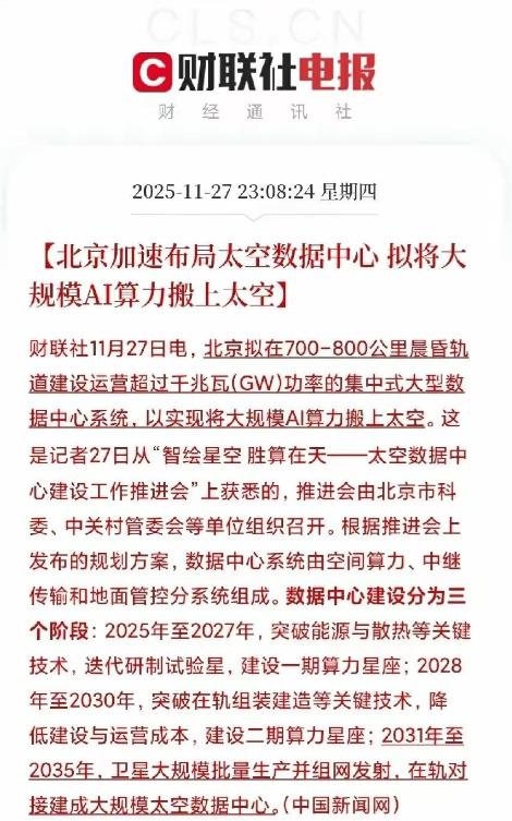 家人们!北京刚放出的太空大动作也太炸了吧!我国正式官宣:要在距离地球 700-800 公里的晨昏轨道,建超千兆瓦功率的太空数据中心,直接把大规模 AI 算力搬上天!这可是太空计算领域的重磅战略布局,未来感拉满。 北京这次把算力搬上天,是真被地面的"电费单"和"水费单"逼急了。您知道现在AI训练有多耗电吗?谷歌一个AI团队一年用的电够美国一座首府城市全家开空调十年,要是把全国数据中心的水管连起来,能绕地球三圈——这还不算未来十年算力需求涨500倍的缺口。 先说散热,英特尔最牛的数据中心,PUE1.06已经是行业天花板,说白了就是用1度电只能干0.94度的活,剩下的全用来给机器降温。 可AI芯片越堆越密,现在顶级机房光冷却塔就要占半个足球场,北京周边的水库都快被抽成"冷却水专用池"了。 太空呢?零下270℃的深空就是天然冰箱,不用一滴水,靠散热板往外辐射热量就行。中科院计算所的专家算过,同样算力规模,太空散热成本只有地面的三分之一。 再说供电,地面数据中心就算全用太阳能,也架不住阴天雨天。北京选的700公里晨昏轨道,卫星24小时晒太阳,太阳能板效率是地面的5倍。 举个实在的:北京规划的千兆瓦级太空数据中心,一年发电量相当于3个葛洲坝水电站,关键是零碳——这对被"双碳"目标卡死的AI产业来说,简直是续命仙丹。 有人问,把服务器搬上天,成本会不会高到离谱?您看"辰光一号"试验星,去年底已经完成总装,用的是国产抗辐射芯片和激光通信模块。 北京的思路很务实:先造"太空积木",每个模块百十公斤,用可回收火箭分批送上去,在轨像搭乐高一样组装。 现在发射成本确实高,但等到2030年火箭回收技术成熟,单公斤成本能从现在的2000美元降到500美元以下——这账算下来,比在北上广深买地建机房便宜多了。 更关键的是数据效率,现在卫星拍的90%原始数据都因为带宽不够被删掉了,比如森林火灾,等数据传回地面再分析,火苗都烧成火海了。 太空数据中心直接在轨跑AI模型,去年"三体星座"的12颗卫星,已经能把火情识别从小时级压缩到分钟级。中科院的团队正在试验"一星多卡"技术,明年发射的验证星能把单星算力提到744TOPS,相当于把地面一台超级计算机塞进卫星里。 有人担心太空环境恶劣,芯片扛不住辐射。这事儿中国团队早有准备:复旦微电的宇航级FPGA已经量产,寒武纪的MLU370-X8芯片通过了太空环境测试。 去年发射的"东方慧眼"卫星,在太空跑了80亿参数的大模型,故障率控制在百万分之一以内。就像给芯片穿上了三层防护服:抗辐射涂层、冗余备份电路、自适应纠错算法。 再说产业协同,北京这次不是单打独斗,而是拉了24家企业搞"创新联合体"。比如火箭有蓝箭航天的可回收技术,散热材料有英维克的太空液冷方案,连卫星"积木"的螺丝都是定制的轻量化部件。 按照规划,2027年先建200千瓦的试验星座,2030年做到40万P算力——这相当于把现在全国的数据中心全搬上天。 当然,挑战也实实在在,太空碎片是个大麻烦,近地轨道有1亿多块毫米级碎片,北京团队正在研发"太空交警"系统,靠激光雷达实时规避。 还有在轨组装,百吨级的太空数据中心,需要机器人像搭积木一样对接,这技术目前只有中美俄掌握皮毛。但别忘了,20年前我们连载人航天都没实现,现在已经能在太空种菜了。 最核心的,是轨道资源的争夺。晨昏轨道就像太空的"黄金地段",不仅光照稳定,还能覆盖全球。国际上遵循"先登先占"原则,美国Starcloud、谷歌都在抢发试验星。 北京选700-800公里,刚好避开拥堵的低轨,又能兼顾散热和通信效率。这一步先手,不光是算力布局,更是在抢占未来太空经济的"十字路口"。 把算力搬上天,不是科幻片里的浪漫,是AI时代的生存之战。当地面的土地、能源、水资源再也撑不起指数级增长的算力需求,太空就是唯一的突破口。 北京这次的布局,就像当年建设深圳特区——在一片空白处搭建新范式,等2035年千星组网,或许我们会突然发现:原来AI的未来,真的在天上。