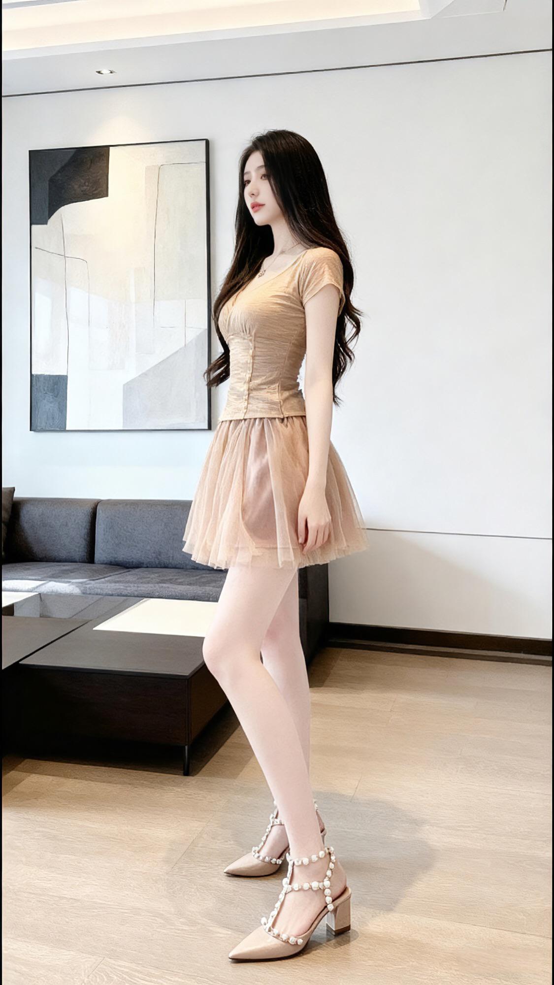 简约而不失格调的穿搭,于细节处绽放独特魅力。精致珍珠高跟鞋与轻盈纱裙相搭,在室内光影下,尽显优雅风情。