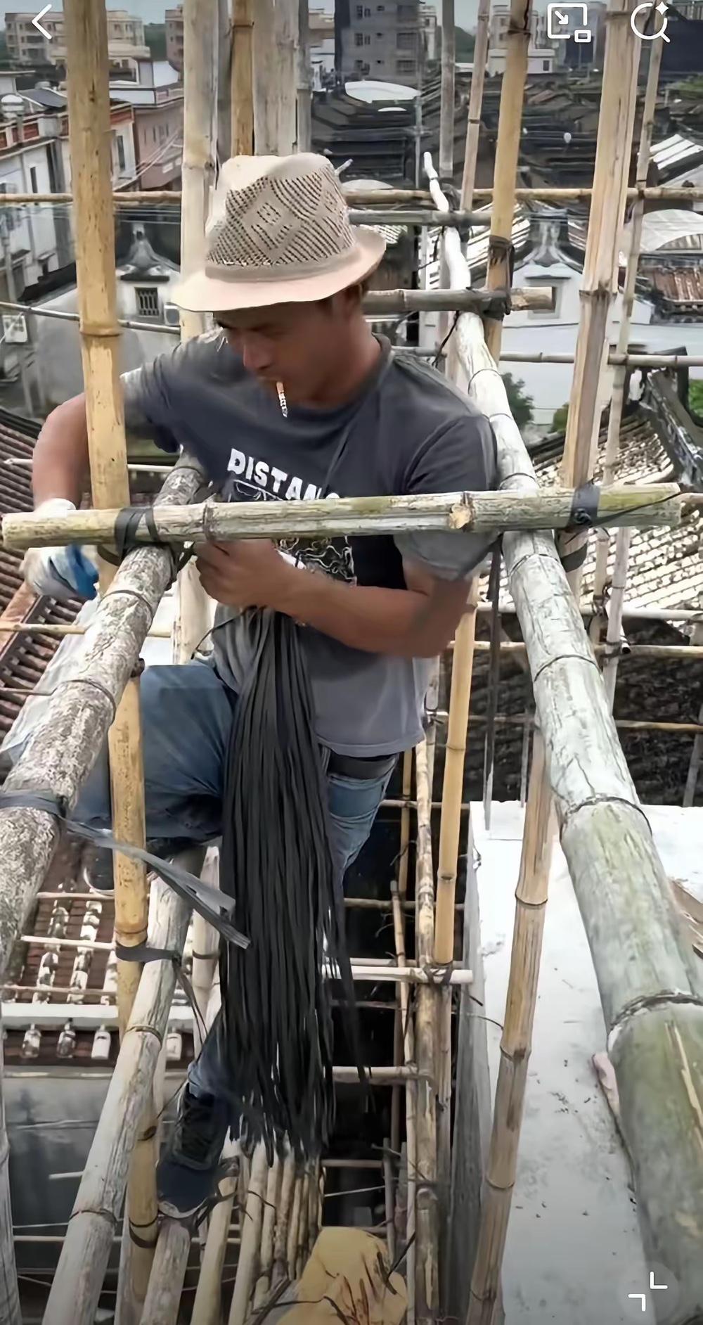 香港靓仔火了,在竹棚架上闲云鹤步,也暴露香港建筑行业乱象 一位年轻的靓仔带着遮阳帽,嘴里叼着香烟,手里忘我的忙活着,时而低头沉思,时而远眺前方,任由嘴里的烟头燃尽,在竹架上迈着悠闲的步子,悠然自在。 他的脚下就是万丈深渊,没有安全绳,没有安全帽,脚踩在光滑的竹杆上完全不知道自己身临危险的境地。稍有不慎就可能出现灾难。 如果烟头随意丢弃可能引起火灾,个人防护不到位可能致人伤亡,香港的建筑行业真的要好好规范了。
