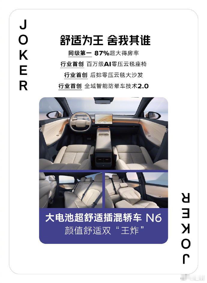 四个2两个王N6叫地主 日产N6这手牌怎么样?四个2:百公里亏电油耗2.79L、21.1度大电池+180km纯电续航、20分钟内快充、年用车成本在“2 千元级”。舒适为王:87%超大得房率、AI零压云毯座椅、全域智能防晕车技术2.0。颜值为王:荣获国际CMF设计奖、0.618黄金比例车姿、Cd 0.248低风阻。