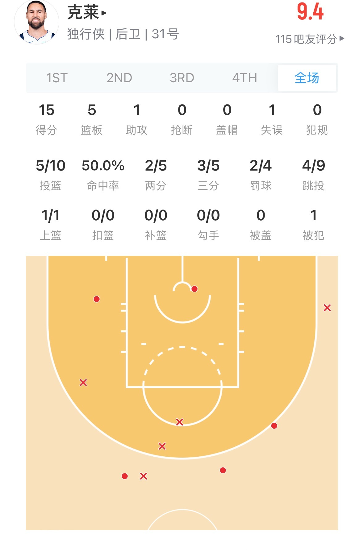 独行侠战胜掘金克莱今天15分 最近5场比赛克莱是场均命中4.2记三分 命中率高达