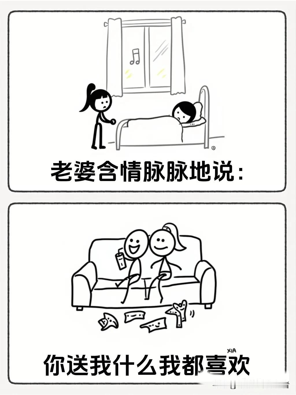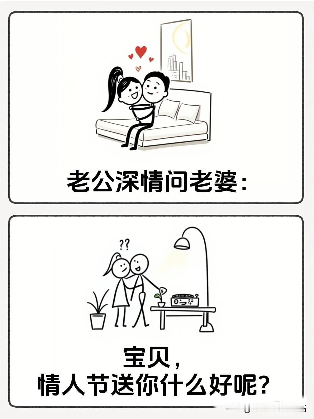趣味漫画:老公深情问老婆:宝贝,情人节送你什么好呢?老婆含情脉脉地说:你送我什么我都喜欢,老公说:那我送你回娘家吧,老婆骂道:滚!