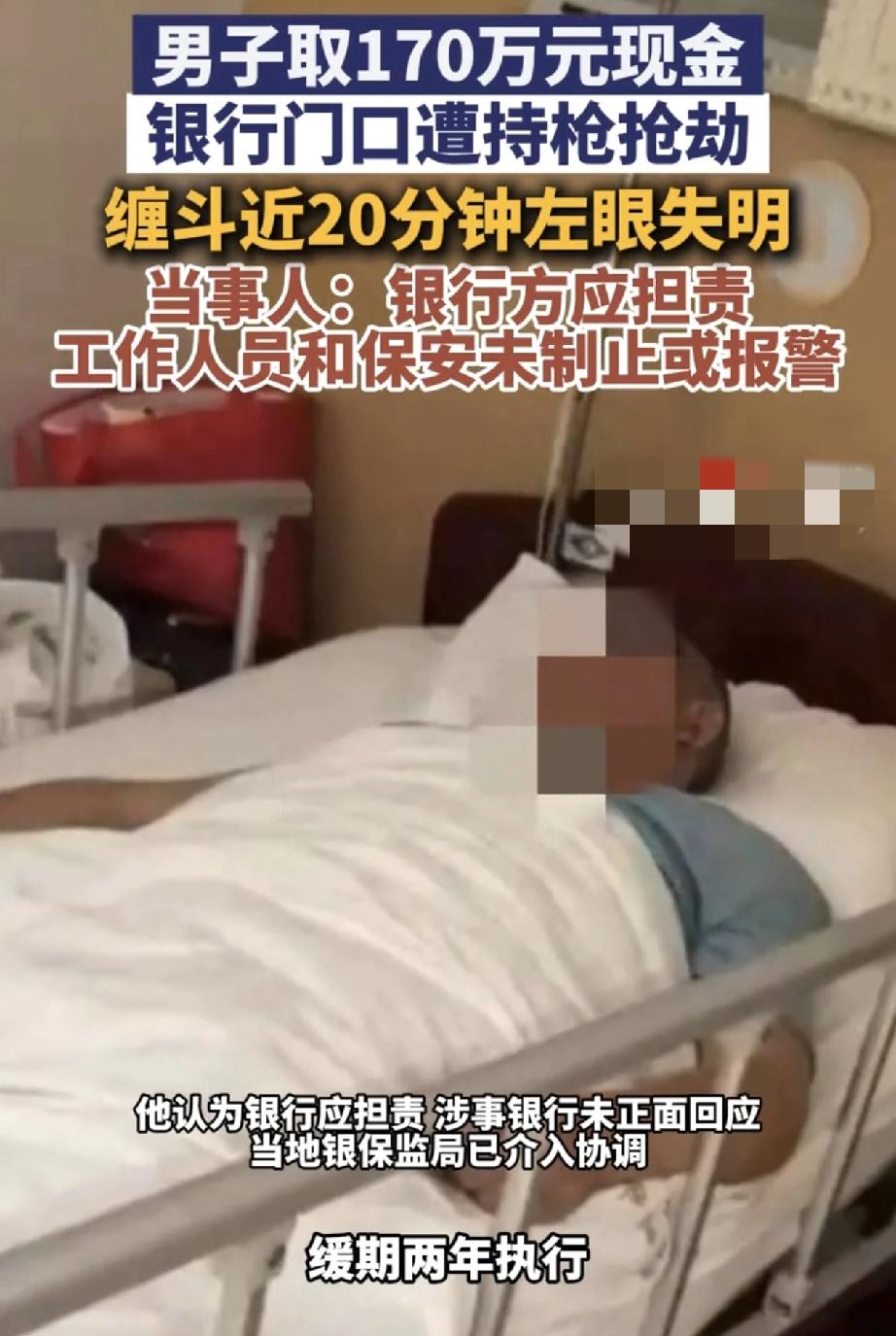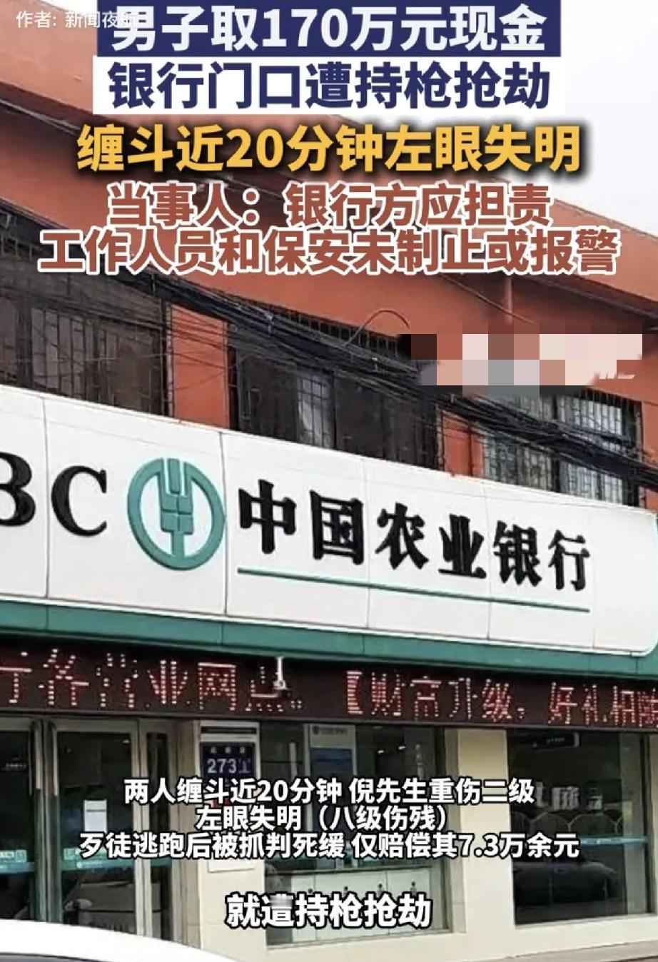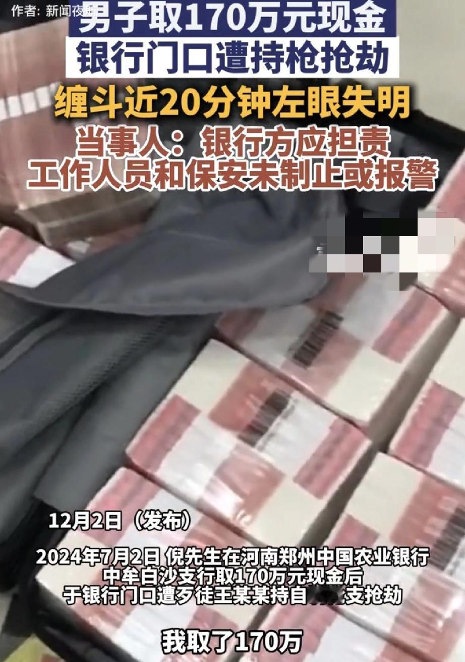 河南一名男子,2024年7月到一家银行取了170万元现金,可刚出银行门口就遭歹徒持枪抢劫。因此歹徒也导致男子重伤,左眼失明(八级伤残),但歹徒逃跑后也被成功抓获,今年二月法院作出了一审判决,歹徒被判死缓,附带民事赔偿7.3万余元。对此男子虽然没有上诉,但他表示此事银行方应担责,因为男子和歹徒缠斗期间,银行工作人员和保安都未及时制止或报警帮助男子。 据悉,当时男子在银行门口和劫匪搏斗了十余分钟,可这期间银行工作人员和保安没有采取制止或报警等任何措施。最终歹徒未能得逞,骑摩托车逃离了现场。而男子虽保住了现金,但其面部却受得了重创,导致左眼失明,后经鉴定为重伤二级、八级伤残。 而歹徒抢劫的原因则是,因其生意失败和期货亏损,所以他提前数日就在该银行蹲点,专盯大额取款客户,于是便盯上了男子发生了此事。 虽然歹徒当日也被成功抓,以抢劫罪判了死缓,并民事赔偿男子7.3万余元,但男子认为,他取款时就提前预约了银行,像这种大额取款,银行应保障其上车落锁前的安全,而当时的工作人员和保安却“冷眼旁观”,存在明显失职! 事发后男子也联系了银行,但对方领导推诿后便无下文。随着事件发酵,目前当地银保监局已介入协调此,尚未有最终结论。 此事也是引起了网友们的一片热议。有网友表示:个人觉得,虽然保安和工作人员不至于为此事拼命,但可以报警啊,这可是最基本的措施,而不是站那看热闹吧。 还有网友表示:支持男子,一般来说,取钱超五万就需和银行预约,若有人泄密,那取现金的时候小人可能已潜伏旁边啦。所以预约不光是让银行早做准备,也是确实应该确保顾客最基本的安全,不然这就是让不法分子有所准备! 也有网友表示:在银行取的钱,在门口都缠斗了十多二十分钟,银行不但没出保安阻拦,还没人帮忙报警,银行这操作确实失职严重,存在很大责任啊! 那么这种情况银行有责任吗? 律师科普道:《民法典》第一千一百九十八条规定,银行等经营场所的经营者、管理者未尽到安全保障义务造成他人损害的,应承担侵权责任。银行门口属于其可控制范围,对大额取款客户负有安全注意义务。‌ 所以这种情况,银行应承担一定责任,而男子也可通过法律途径,主张银行未尽安全保障义务的侵权责任。