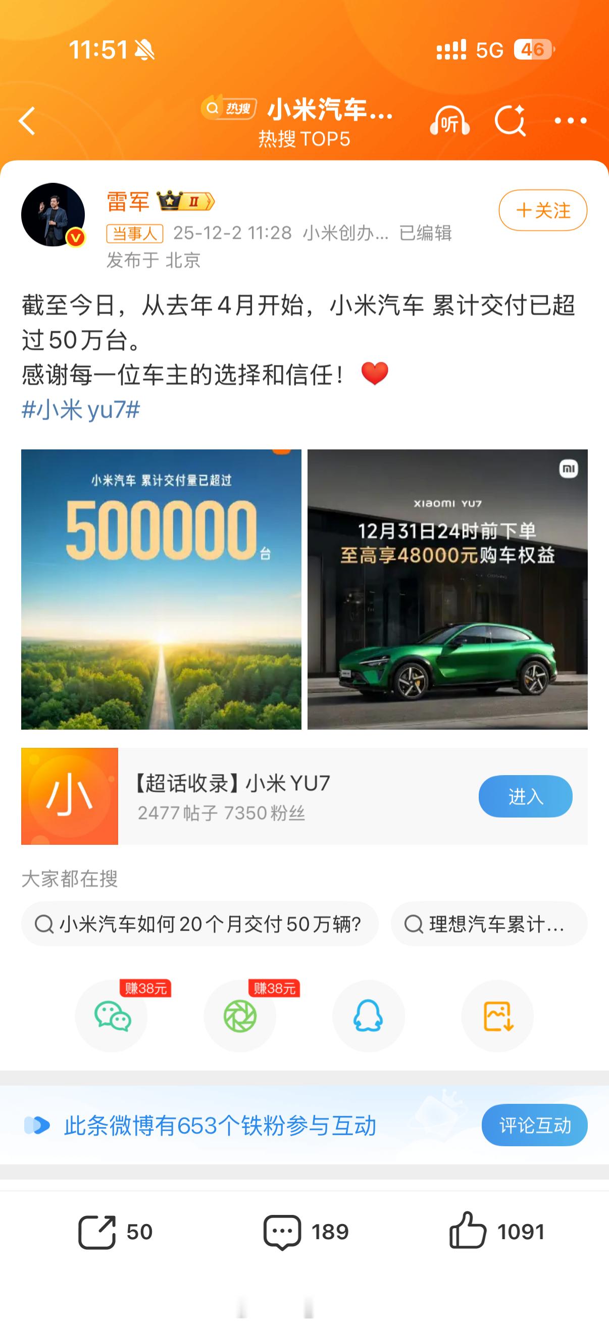 好家伙小米汽车已经交付超过 50 万辆了,而今年小米汽车交付量已超全年目标,看来小米的产能提升确实可以,短短一年多的时间直接从0来到了50万,销量突破100万应该更快吧所以说嘛,某些人再怎么黑都没用,因为小米汽车的产品力摆在那里,整各种无中生有的东西有什么用,几十万车主的好评可不是虚的