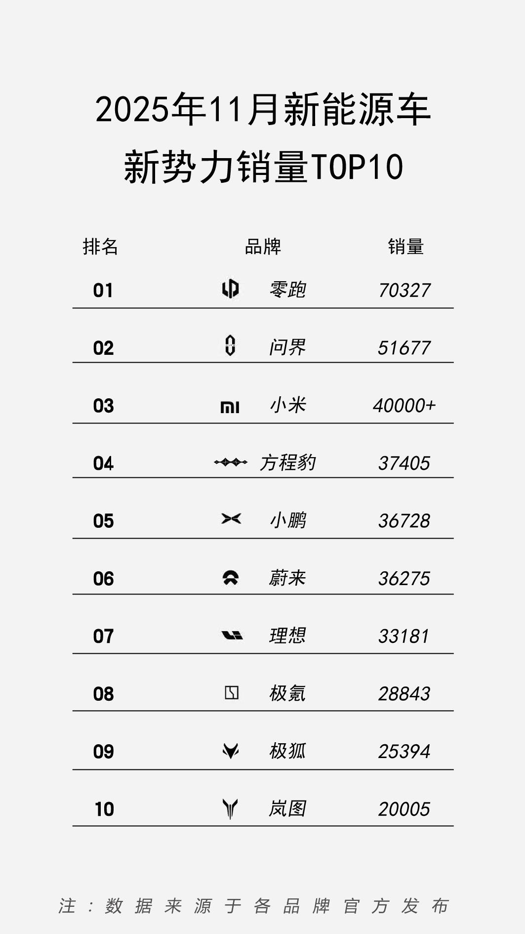 2025年11月新能源车新势力销量榜出炉,零跑以70327辆的成绩登顶榜首,问界、小米紧随其后分列二三位。方程豹以37405辆的销量跃居第四,超越蔚小理成为本月最靓的仔。传统新势力小鹏、蔚来、理想稳居中游,而极狐、岚图也成功跻身前十,新能源市场的竞争格局正不断刷新。比亚迪 方程豹 蔚来 小鹏汽车