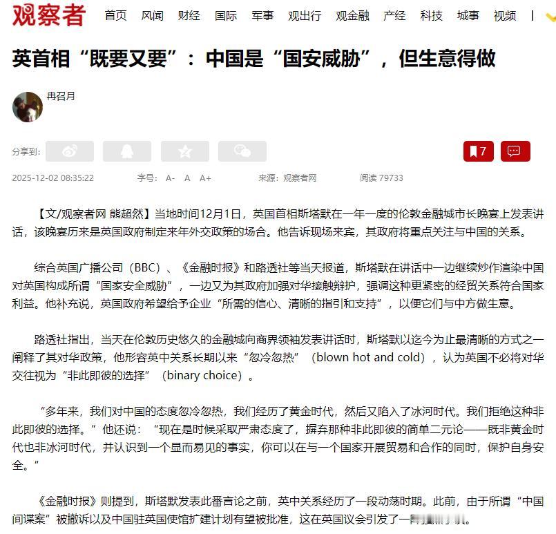 英国真当中国没脾气? 当地时间12月1日,英国首相斯塔默公开表示:中国的存在会对英国造成“国家安全威胁”,这话刚说完没多久,他就话语一转,开始强调英国企业跟中国做生意的重要性,这“既要又要”的态度,还真是让我大开眼界! 不过,我觉得也侧面表明了,英国本身是存在很大问题的,不然也不会一边炒作,一边又离不开,这不妥妥搞笑呢吗? 斯塔默这套“喊着威胁要生意”的操作,看似矛盾,实则藏着英国当下的多重考量,核心还是绕不开国内发展与国际站位的拉扯。 从官方公开的信息来看,这种“既要又要”的表态,不只是经贸层面的纠结,更掺杂着英国内政派系平衡、产业转型刚需以及对国际格局的误判,说到底,还是英国对自己的国际定位没搞清楚。 咱们先来看看英国内政,斯塔默领导的工党政府本身就面临议会内部的派系压力,这也是他作出矛盾表态的直接原因之一。 英国议会里一直有不少对华强硬派,动辄拿“国家安全”说事,之前炒作的所谓“中国间谍”议题,即便检方撤诉仍被反复翻炒。 斯塔默刻意强调中国是“国安威胁”,很大程度是为了安抚这部分势力,争取政策推进的议会支持。 但另一方面,工党竞选时就承诺要提振经济、增加就业,而中国市场对英国不少支柱产业来说是刚需,这就逼着他不得不向商界释放合作信号,这种表态本质上就是一场无奈的政治妥协。 而这种政治上的妥协,背后更离不开产业发展的现实刚需推着走,这也是官方资料里反复提及的重点。 英国近年来一直在推进“绿色工业革命”,目标是2050年实现碳中和,而中国在光伏组件、风电设备等绿色能源产业链上的优势是公认的。 根据英国商业、能源和工业战略部的报告,英国绿色能源产业的发展需要大量优质且性价比高的核心设备,中国供应链是重要选项。 除此之外,英国的高端化工、医疗器械等产业也依赖中国市场的出口份额,这些实打实的产业需求,让英国政府根本不敢真的跟中国“脱钩”,这也正是斯塔默必须明确提“支持企业对华做生意”的关键原因。 如果说内政压力和产业刚需是斯塔默“既要又要”的直接推手,那更深层的根源,还在于英国对国际战略格局的误判。 脱欧之后,英国一直想维持“全球大国”的站位,既想紧跟美国的对华步调,又不想放弃在欧洲和亚太地区的经济利益。 从英国外交部的外交战略文件能看出,其试图在“价值观同盟”和“经济务实主义”之间找平衡,但这种平衡本身就不成立。 就像中国外交部多次强调的,合作和对抗是零和选项,把经贸合作和安全问题捆绑,本身就是错误的逻辑。 最终的结果只会是两头不讨好:既破坏了中英合作的互信基础,也会拖累英国自身的发展节奏。 说到底,国家间的交往核心是互利共赢。英国要想走出当前的政策纠结,关键还是要放下意识形态偏见,尊重彼此核心利益,这才是让中英关系走稳走实的唯一出路。