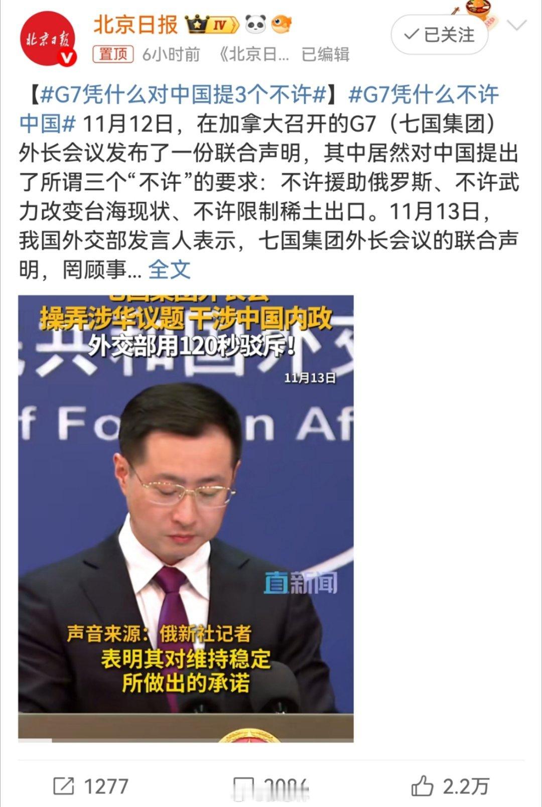 G7凭什么对中国提3个不许G7凭什么不许中国11月12日,G7外长会议在加拿大发布联合声明,公然对中国抛出“不许援助俄罗斯、不许武力改变台海现状、不许限制稀土出口”的无理要求。对此,我国外交部于13日严正回应:声明罔顾事实、颠倒黑白,蓄意污蔑抹黑中国,粗暴干涉中国内政,中方强烈不满、坚决反对。作为早期发达工业国家组成的“俱乐部”,G7自诞生起就缺乏全球代表性与合法性,其初始使命仅为应对石油危机,如今却越界充当“国际裁判”,对他国事务指手画脚。数据显示,G7人口仅占全球9.6%,GDP占比降至28.4%,制造业占比32.9%,与中国28%的制造业占比已相差无几,其话语权早已失去实力支撑,根本无权对主权国家发号施令。所谓“三个不许”,本质是霸权逻辑的赤裸彰显。在俄乌问题上,中国始终秉持中立立场劝和促谈,从未向任何一方提供致命性武器,严格管控军民两用物项出口,西方情报部门亦无任何实锤证据。反观G7,长期向乌克兰输送武器、加码对俄制裁,却在制裁失效后将中国当作“替罪羊”,转嫁自身战略失误的责任。在台海问题上,G7的表态更是荒谬至极。台湾是中国领土不可分割的一部分,解决台湾问题是中国人的内政,不容外部干涉。而G7国家一面持续对台军售,仅2024年以来美国对台军售金额已超18亿美元,暗中纵容“台独”分裂势力;一面倒打一耙指责中国“改变现状”,这种“只许州官放火,不许百姓点灯”的双标行径,严重破坏台海和平稳定的根基。至于限制稀土出口,中国的相关管控完全是行使主权的正当权利,符合《稀土管理条例》及国际通行做法,目的是保护资源、维护生态安全与全球产业链稳定。G7长期享受中国低价稀土供应,却在中方规范管理时横加指责,殊不知全球九成以上稀土加工产能与核心专利掌握在中国手中,其自身搞芯片封锁、贸易壁垒的双标行径,才是真正的“经济胁迫”。G7如今的对华发难,根源在于自身相对衰落的焦虑与内部矛盾的凸显。面对对俄制裁“偷鸡不着蚀把米”的困境,面对内部在国际事务上的分歧丛生,G7试图通过抹黑中国转移焦点、遏制中国发展,这种图谋注定不会得逞。中国从不惹事,但绝不怕事。对于核心利益与主权尊严,我们寸步不让;对于国际合作,我们秉持开放包容。奉劝G7认清多极化时代大势,摒弃冷战思维与霸权心态,停止搞封闭排他的“小圈子”,停止干涉他国内政,回到平等对话、务实合作的正确轨道上来。任何企图遏制中国发展、挑战中国底线的行为,都将遭到坚决反击,最终自食恶果!