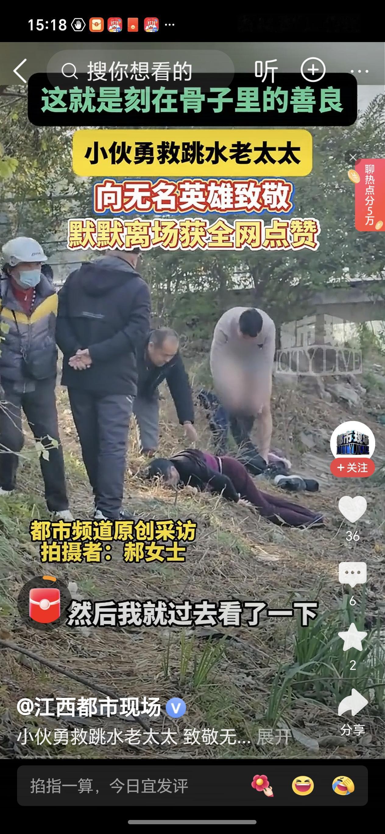小伙勇救跳水老太太后默默离场近日江苏徐州,一小伙跳水中救一位轻生的老太太,救人上岸后,小伙穿上衣服默默地走了,为这位见义勇为的小伙点赞,致敬这位无名英雄!