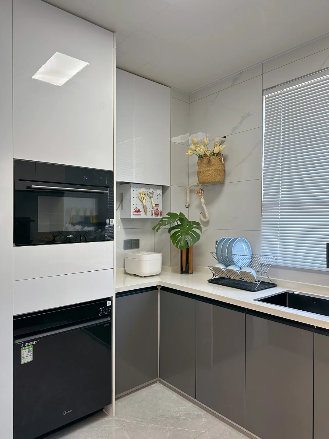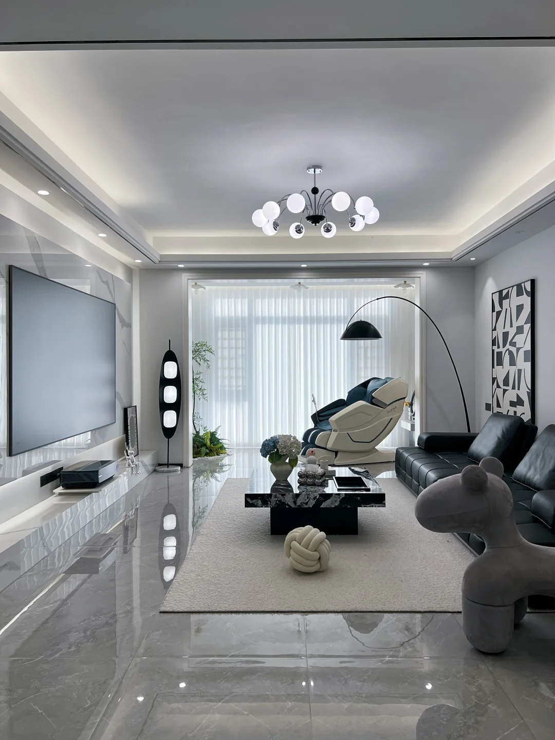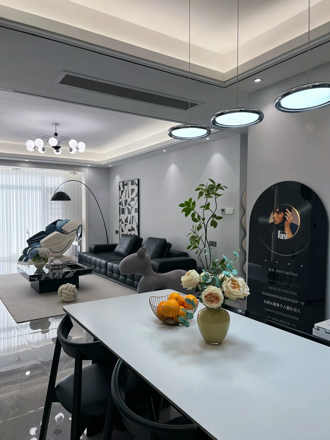 我家套内105平,三室两厅一厨两卫 分享全屋简单好抄作业的搭配思路: 【配色】70%灰色+20%白色+10%黑色,空间丰富有层次、不单一 【硬装】保留原始层高,做的回字形平吊,阳台没有做晾衣架,跟客厅相连,空间更显大 【软装】基本上都是和空间颜色相匹配,不会显得杂乱,也提升质感;黑色皮质沙发点亮空间