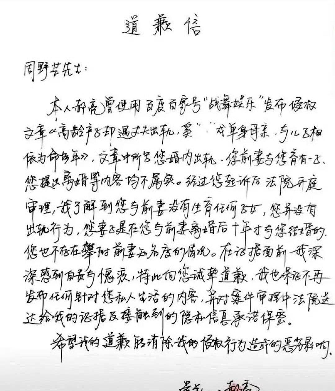 你说这世上还真是啥人都有,没事儿你干点什么不好? 就因为有人张嘴瞎编,说周野芒老师婚内出轨,连孩子的事都编排得有鼻子有眼。 他拿起法律武器直接把人告了,法院最终判定那些全是假的,造谣的只好写信承认自己胡说八道。 人家“豹子头”把这不白之冤一扛就是三十年,现在他站出来用一纸判决把所有脏水都泼了回去,就是要堂堂正正地过完下半辈子。