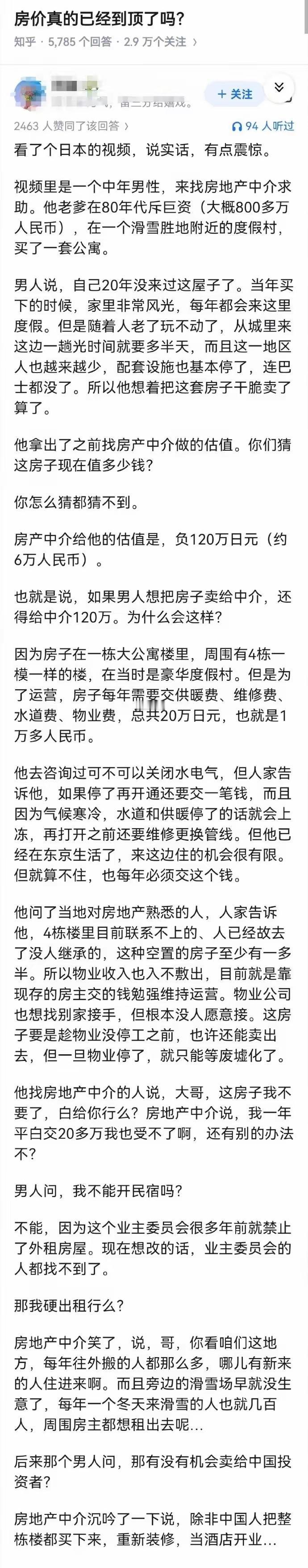房价真的已经到顶了吗? 到没到顶不知道,到一定还没有到底!! 小日子房地产崩盘以后,30年了还没有恢复元气,经济受到了巨大打击,元气大伤,难以恢复!! 小日子的房子成了负资产,什么意思呢? 你让中介给你处理房子,还得倒贴钱,真的吗?难以置信啊,这是什么时候的事情? 最近,我听中国著名经济学家,房地产专家,被誉为中国房地产之父的孟晓苏说,小日子房地产已经复苏很多年了,已经大涨,超过了历史最高峰,真的么,太吓人了! 孟总还说,我们的房地产,不可能变成下一个小日子的,我们跟他们不一样,我们有巨大的增量空间,有巨大的机会,他们还没有,不可同日而语!太猛了,孟总,看来经济恢复和振兴,只能依靠房地产了,加油!